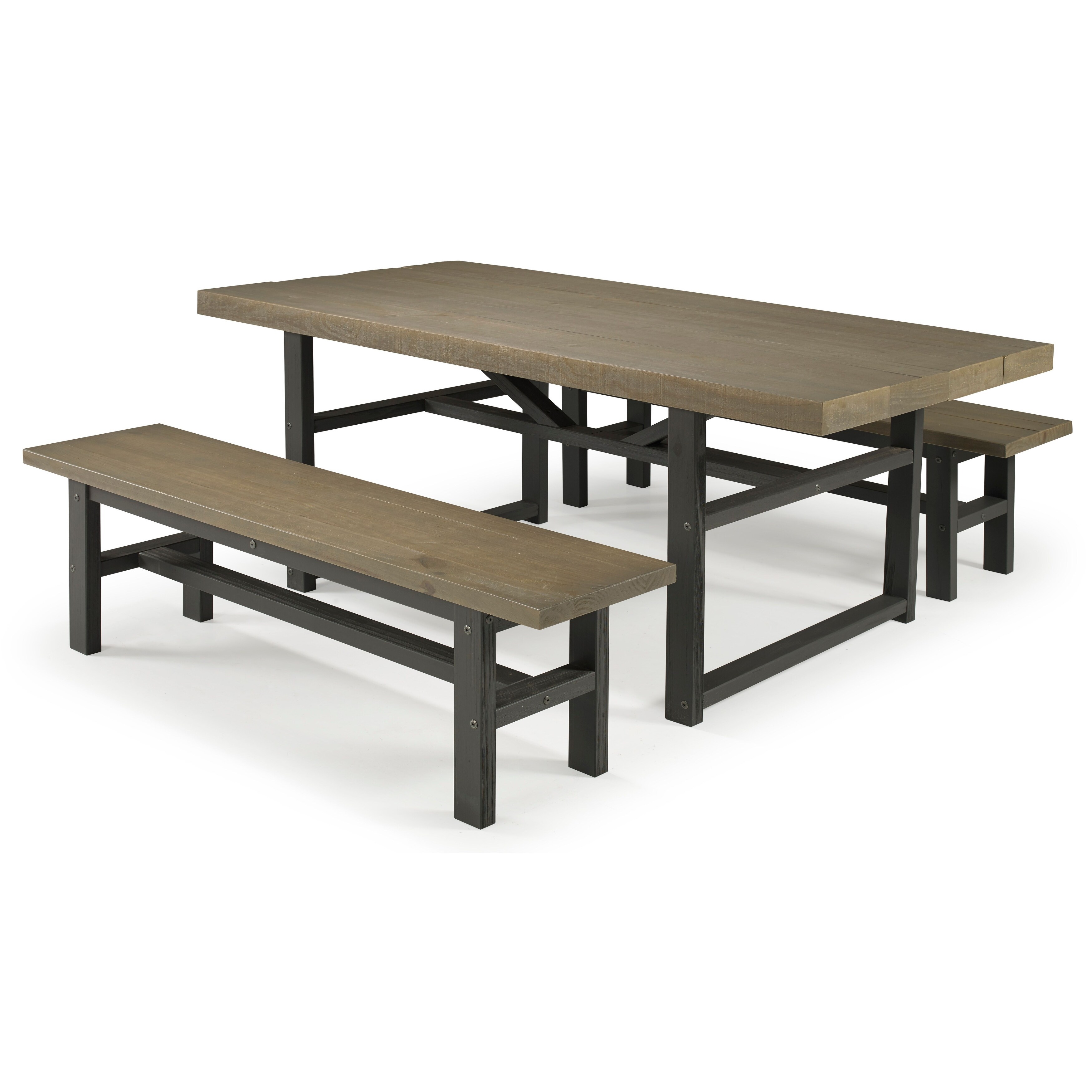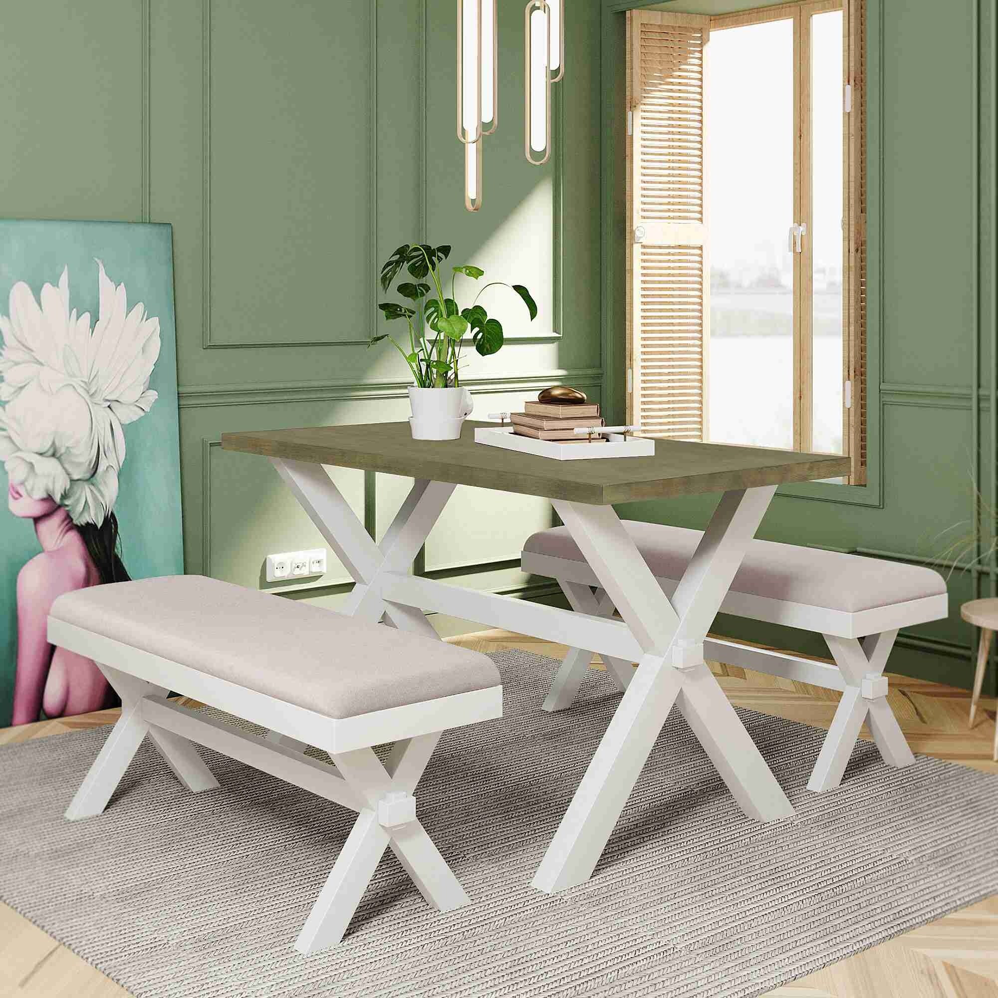 3-Piece Farmhouse Rustic Wood Dining Set with Upholstered Benches, Modern X Design