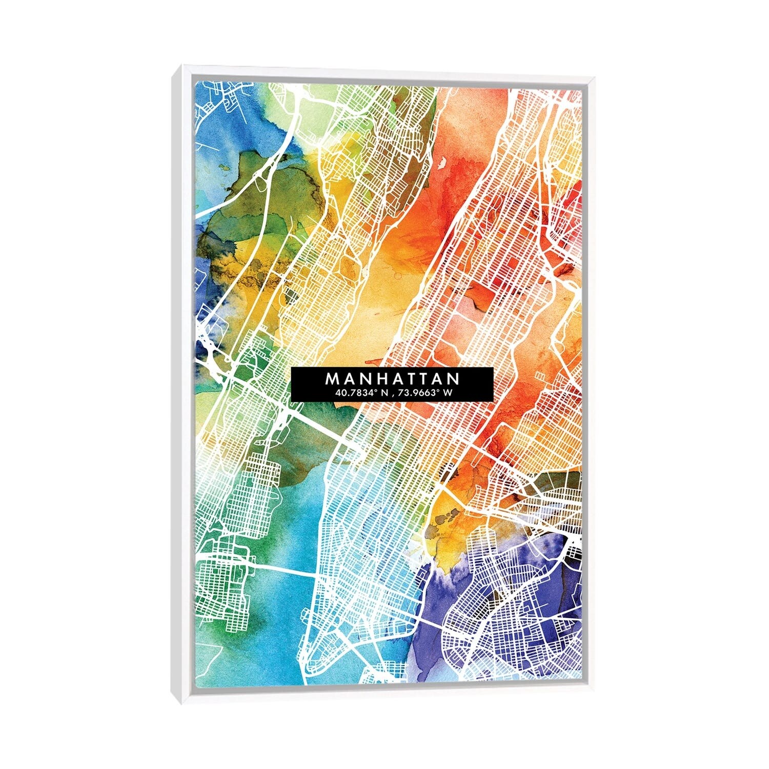 iCanvas "Manhattan City Map Colorful Watercolor Style" by WallDecorAddict Framed Canvas Print