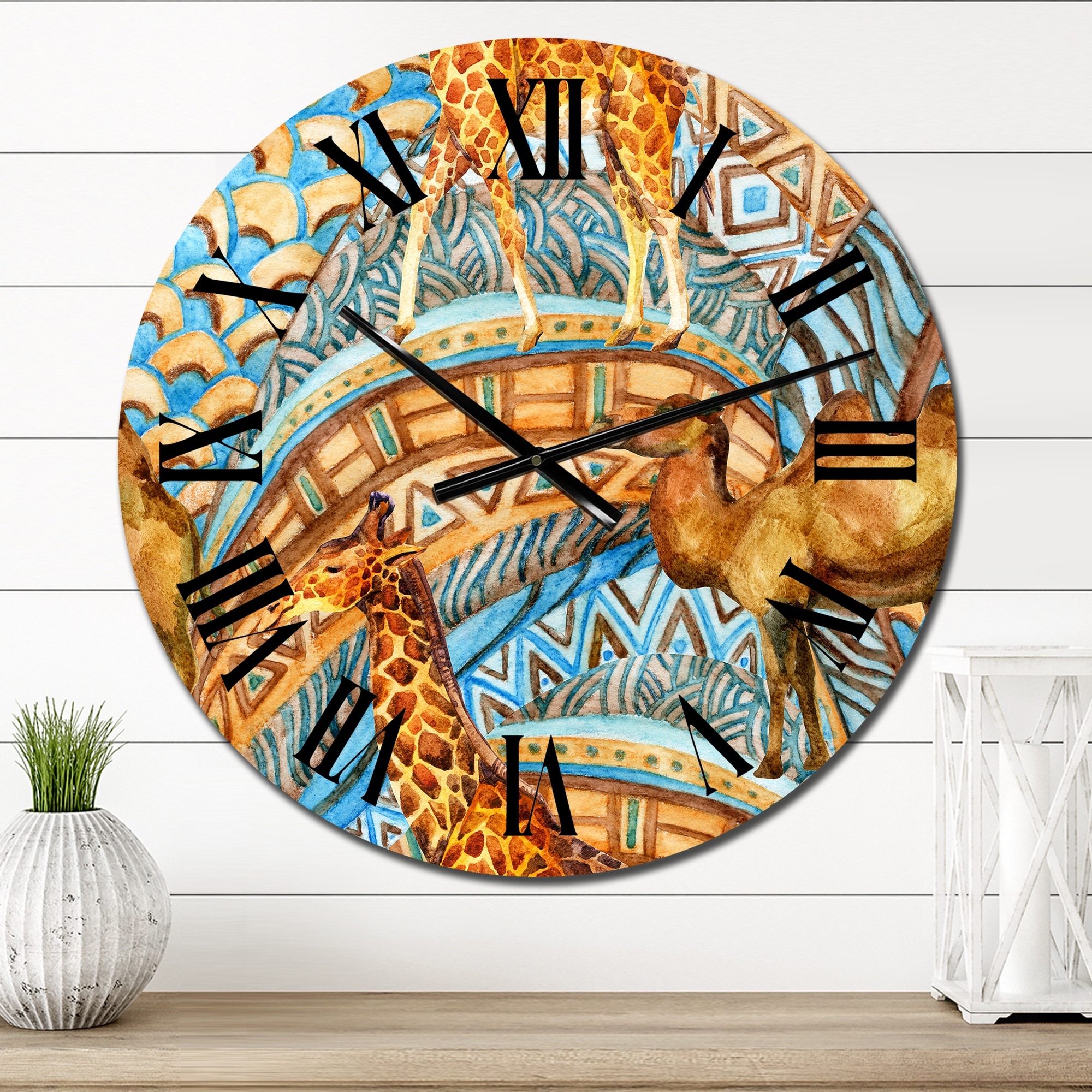 Designart 'Giraffe And Cameleon on African Geometrics' Patterned wall clock
