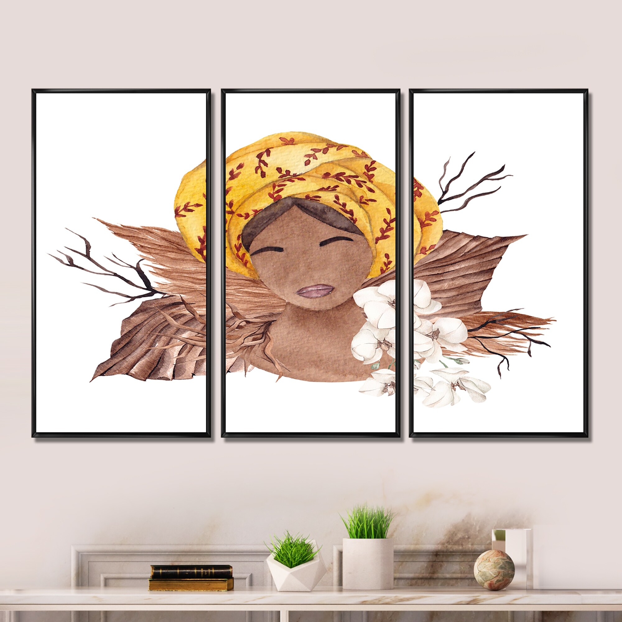 Designart "African American Woman, Dried Flowers, Leaves V" Glam Framed Art Set of 3 - 4 Colors of Frames