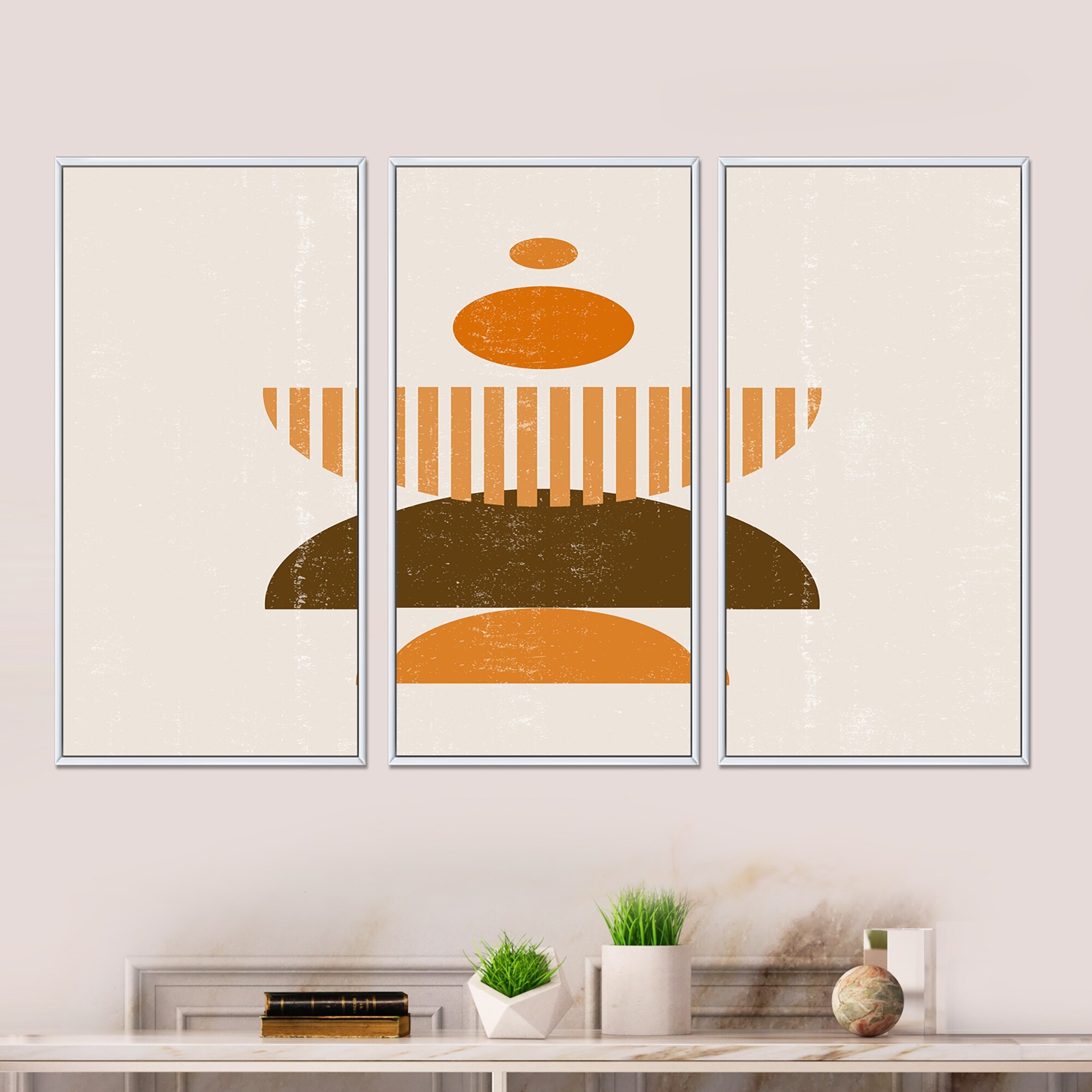 Designart "Abstract Minimal Sun and Moon in Earth Tones I" Modern Framed Artwork Set of 3 - 4 Colors of Frames