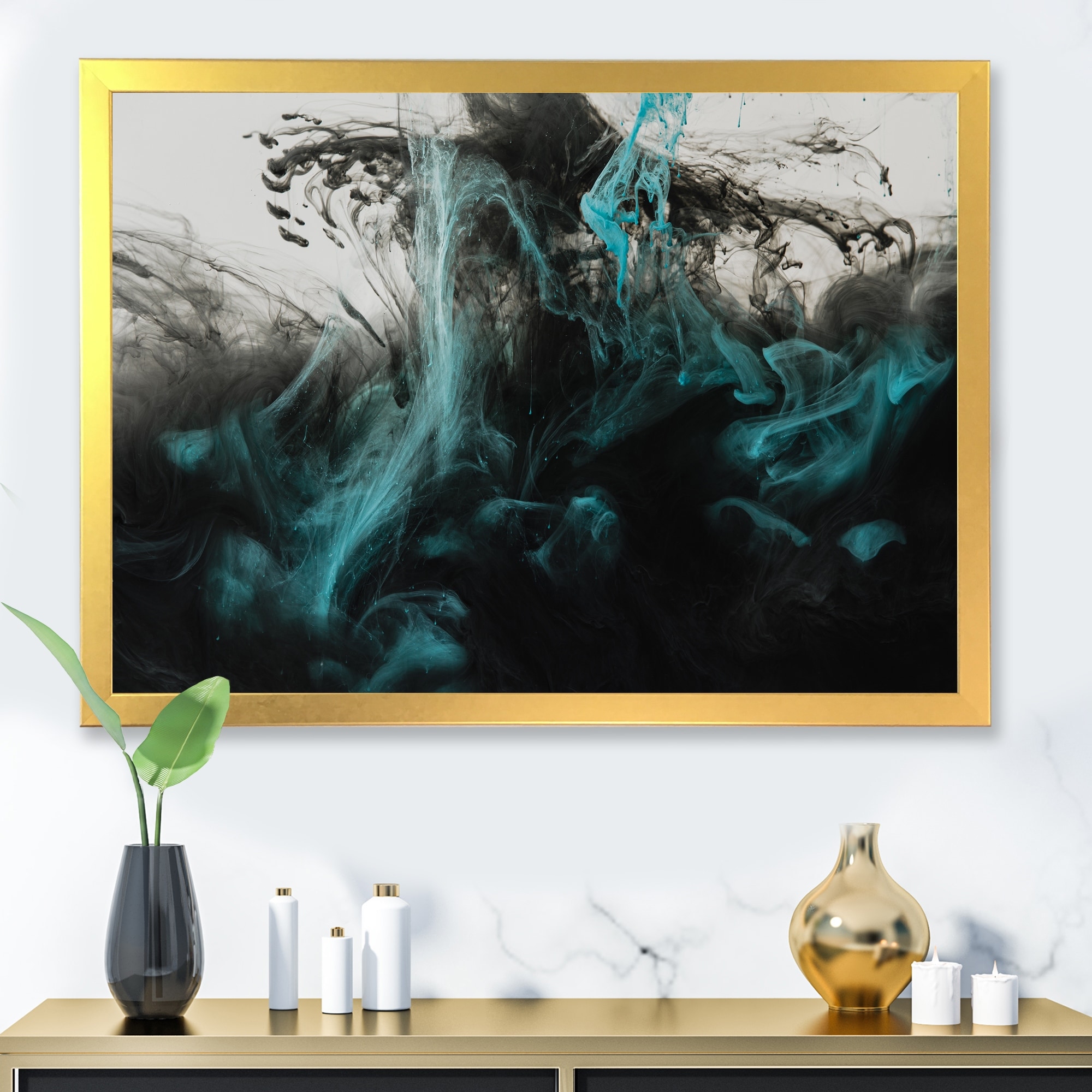 Designart "Black & Turquoise Mixing Liquid Ink II" Abstract Framed artwork