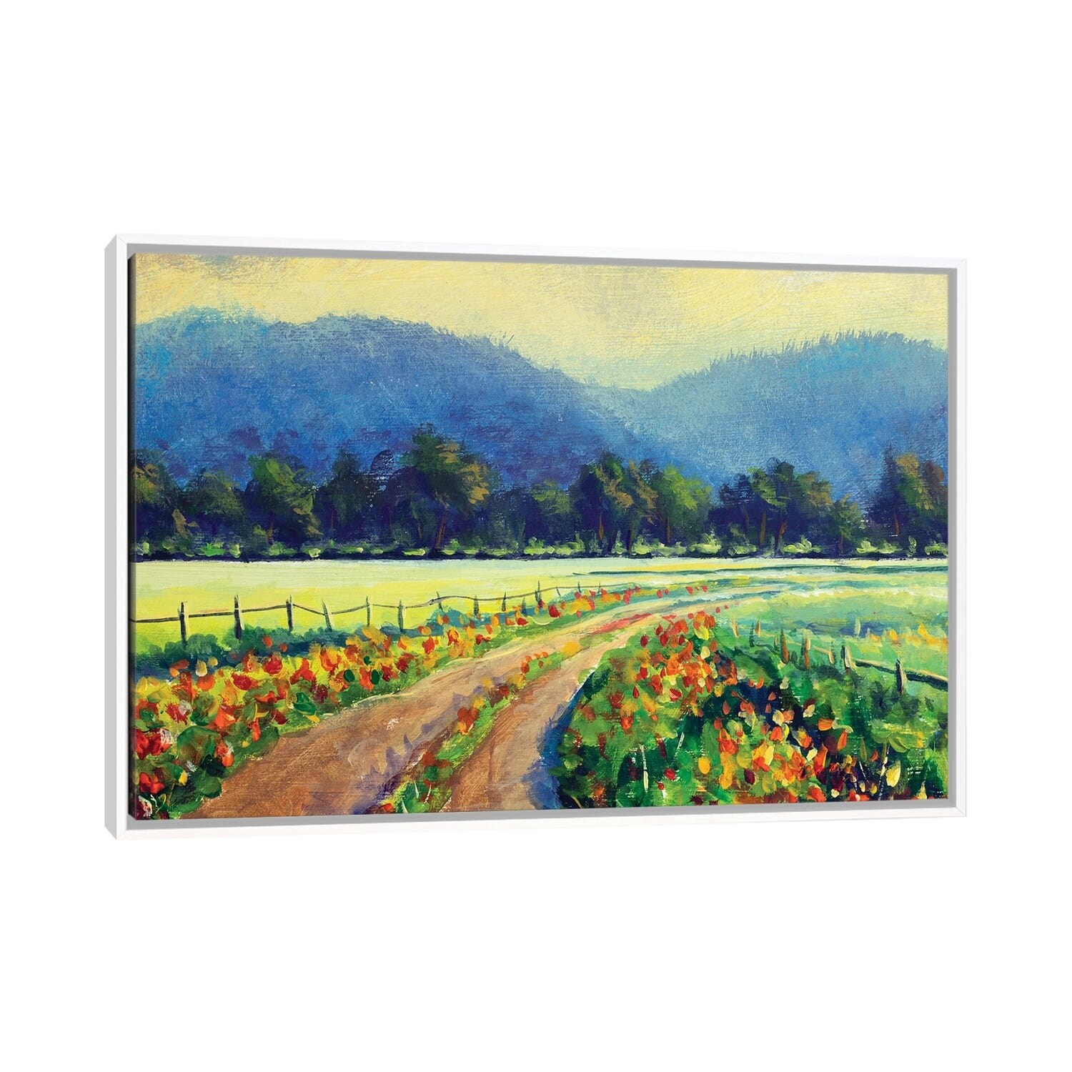 iCanvas "Rural Landscape, Road Among Red Wildflowers Through Field to Mountains" by Valery Rybakow Framed Canvas Print