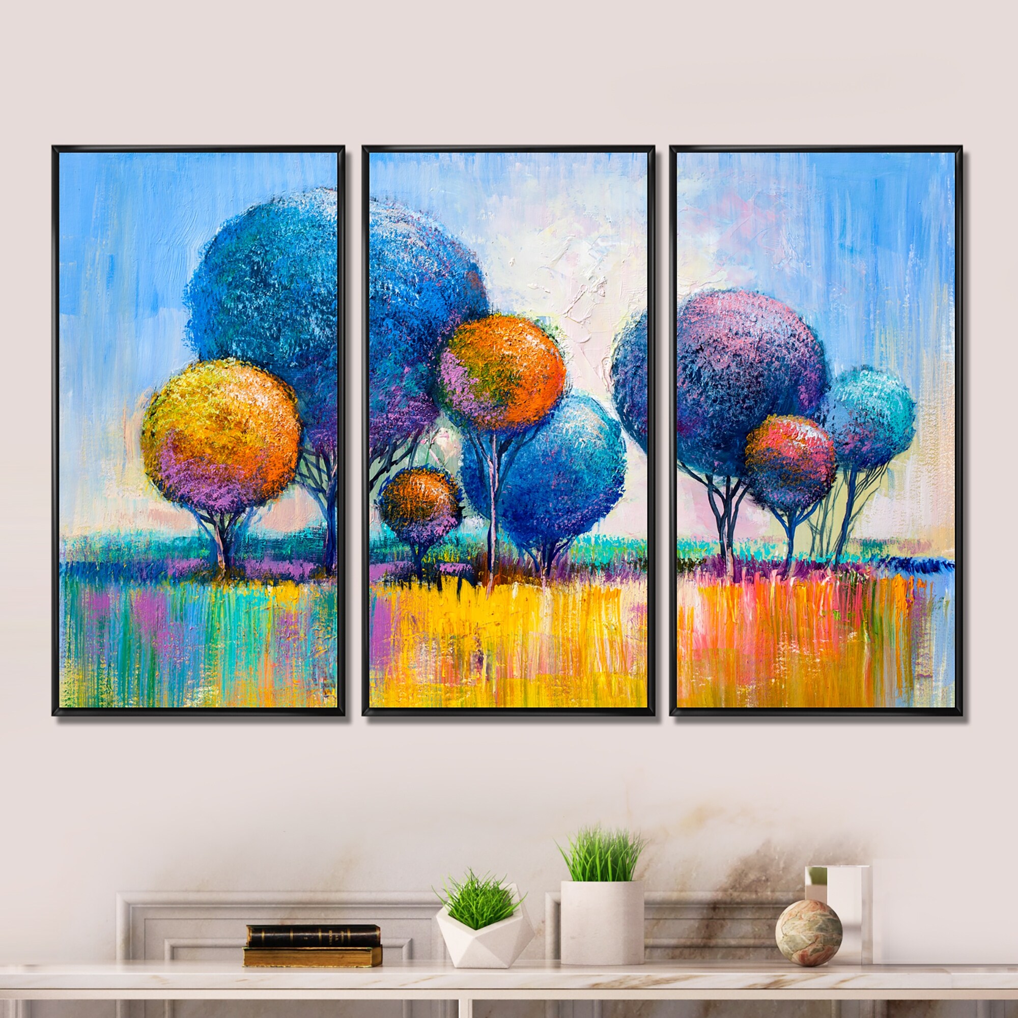 Designart "Autumn Fantasy Trees IV" Modern Framed Artwork Set of 3 - 4 Colors of Frames