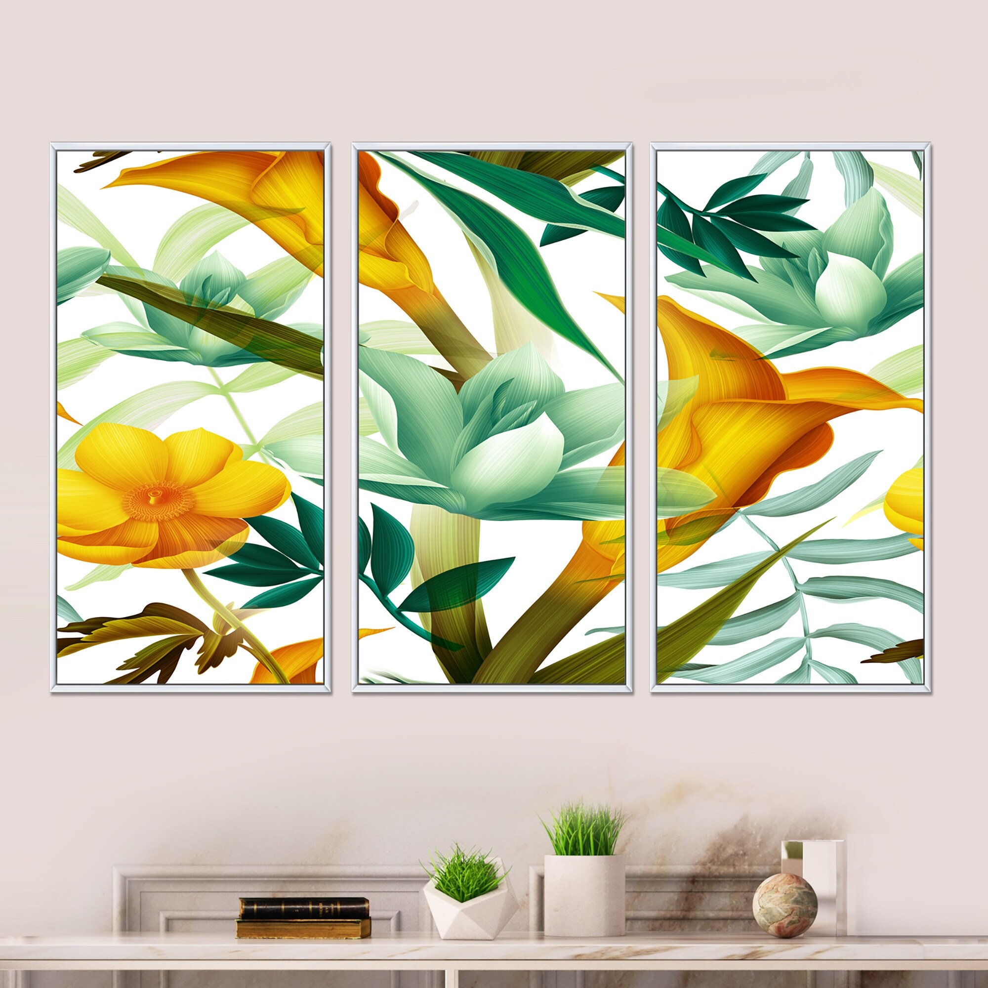 Designart "Tropical Foliage and Yellow Flowers III" Modern Framed Artwork Set of 3 - 4 Colors of Frames