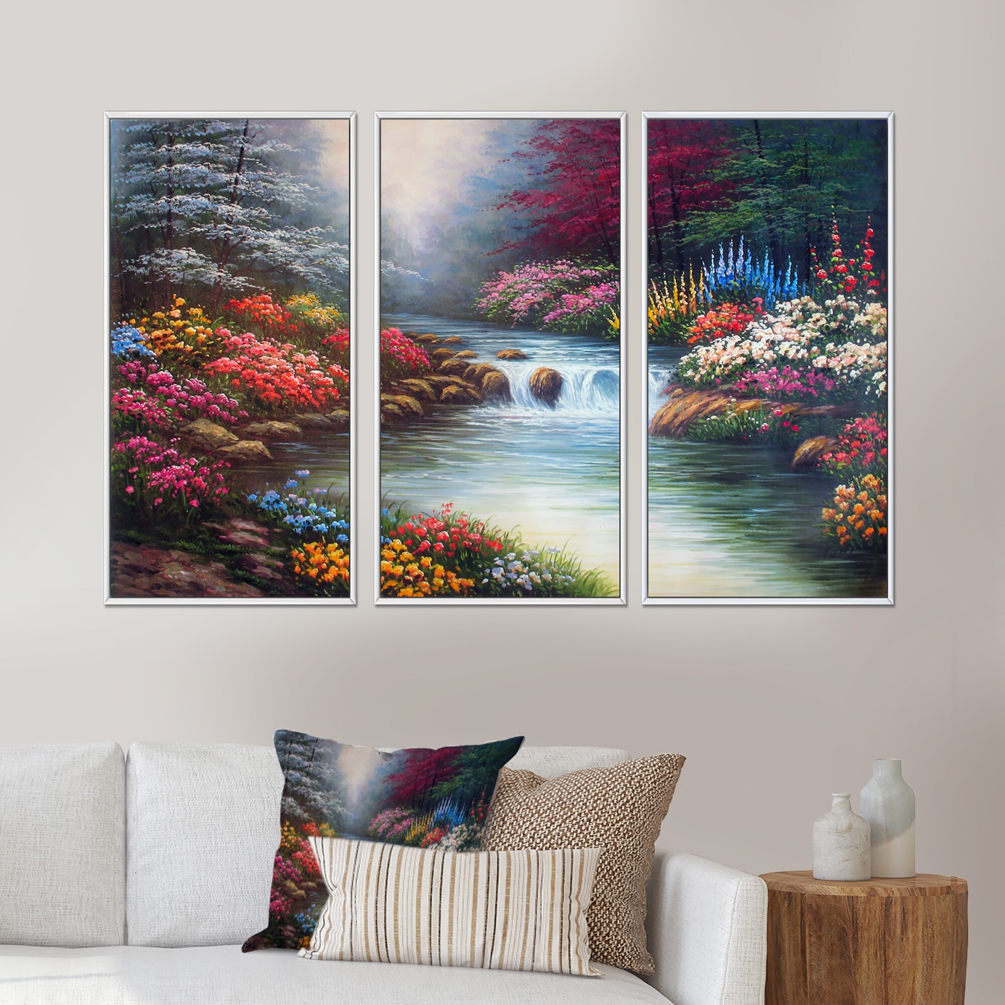 Designart "Flower Garden in River Side" Floral Framed Artwork Set of 3 - 4 Colors of Frames