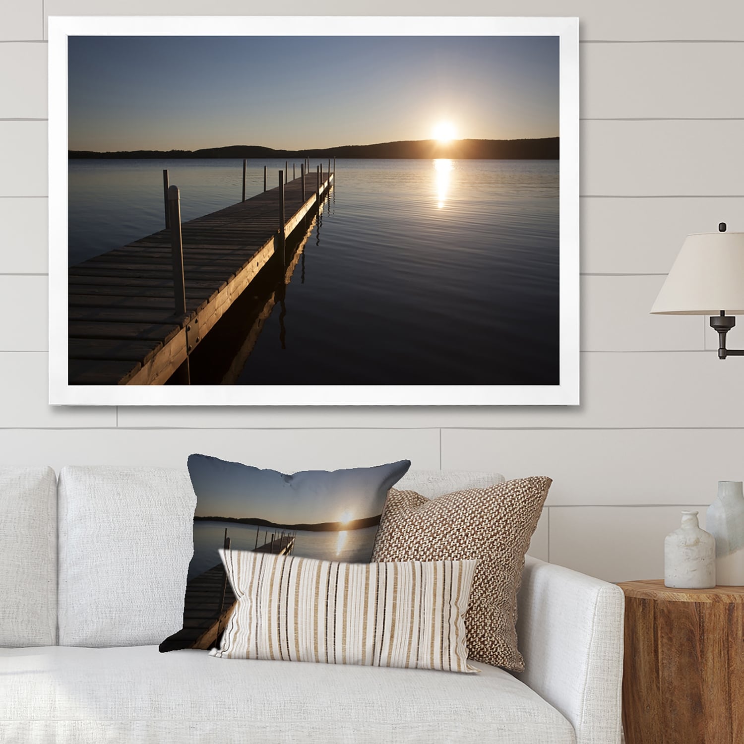 Designart "Lake Pier on Sunset Scenery" Lake House Framed artwork
