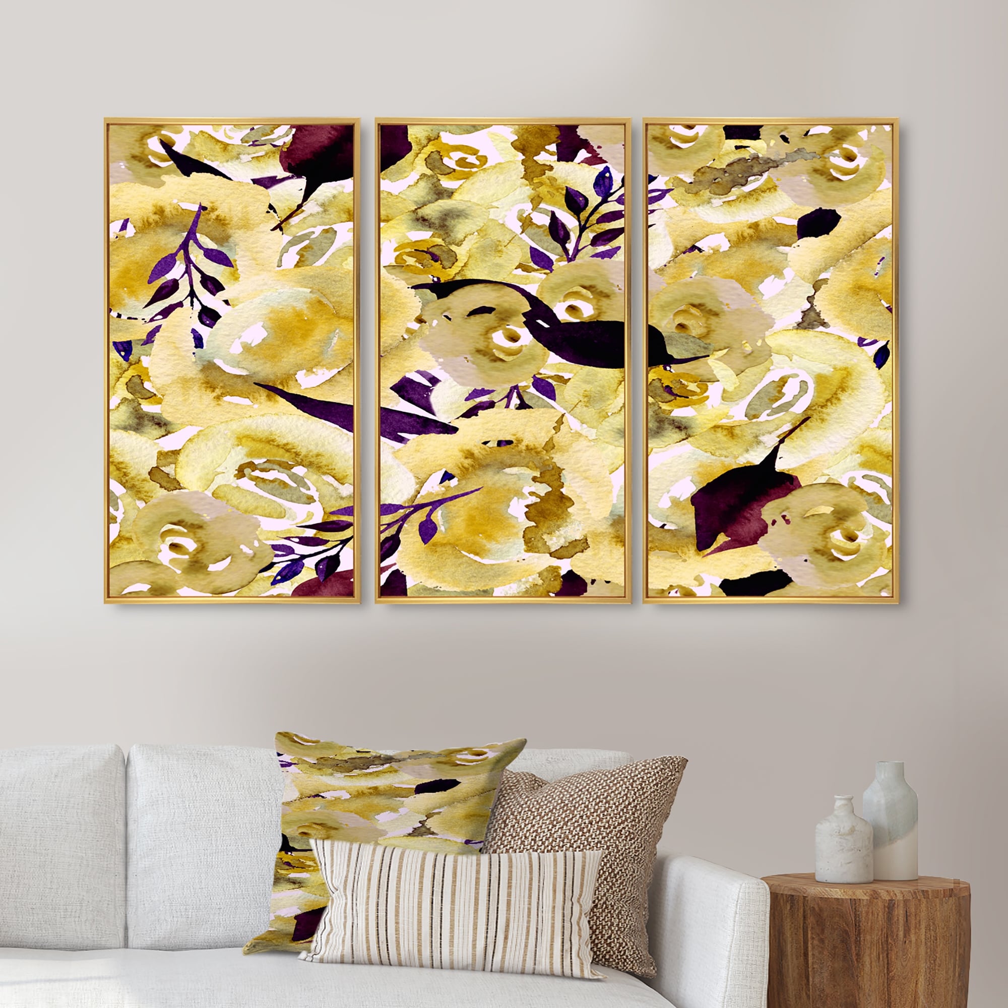 Designart "Yellow And Purple Retro Pattern" Patterned Framed Artwork Set of 3 - 4 Colors of Frames