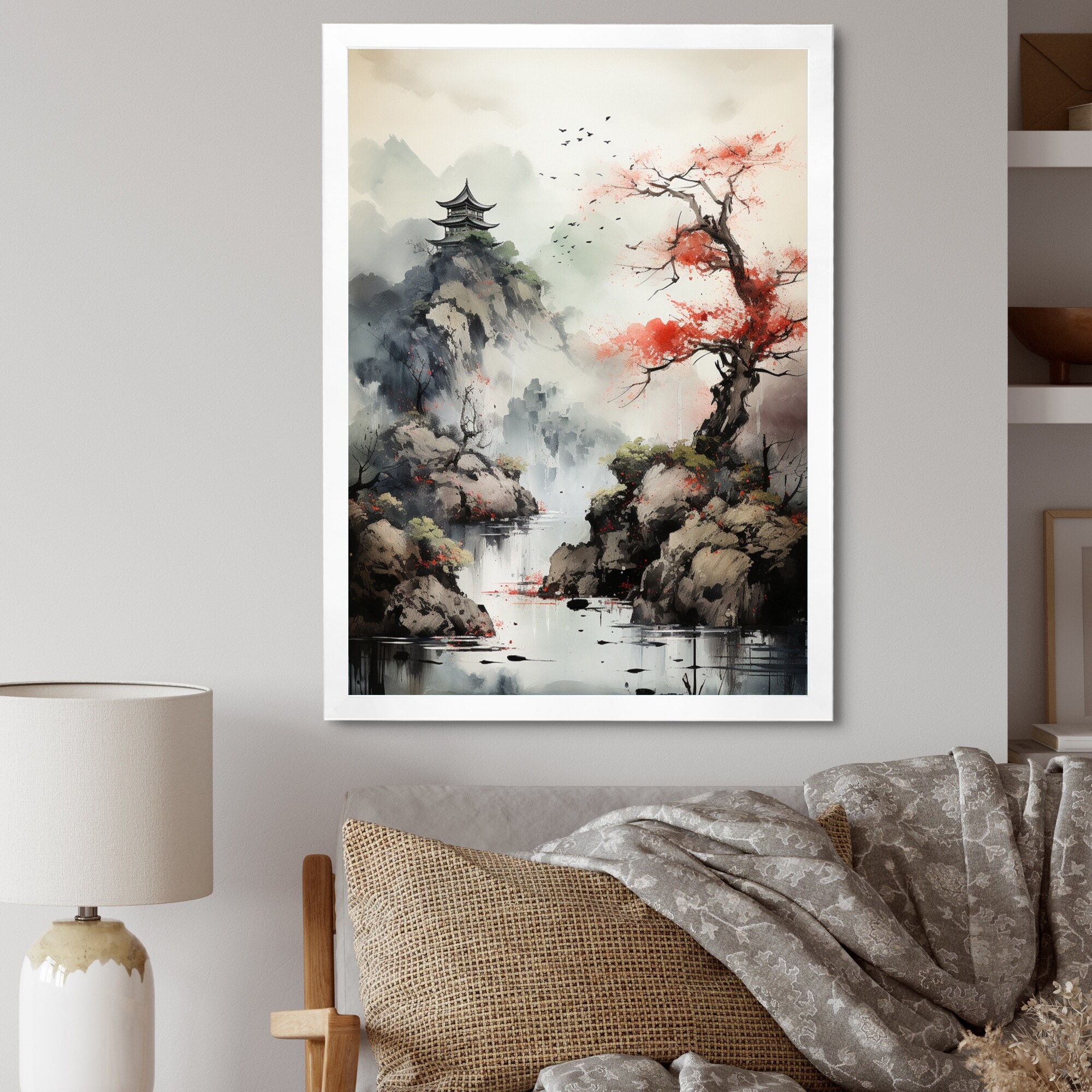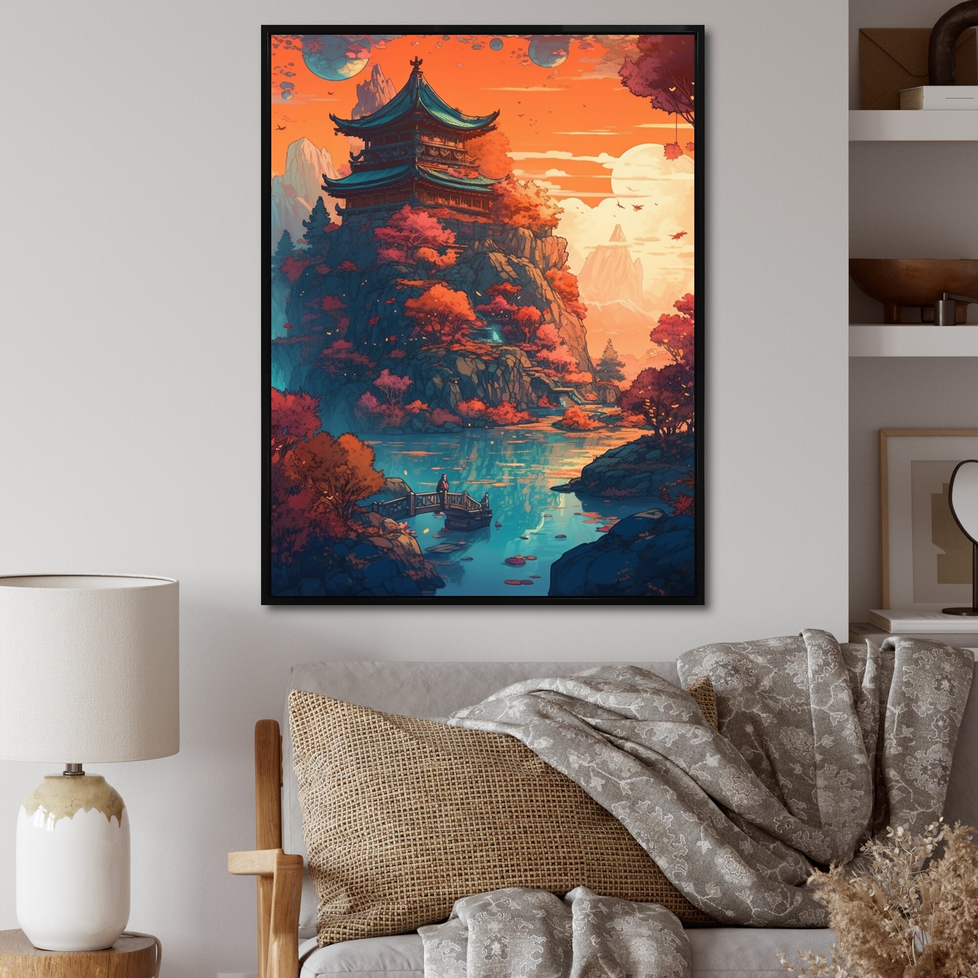 Designart "Asian Mountain And Lake Illustration I" Japon Landscape Framed Canvas Art Print