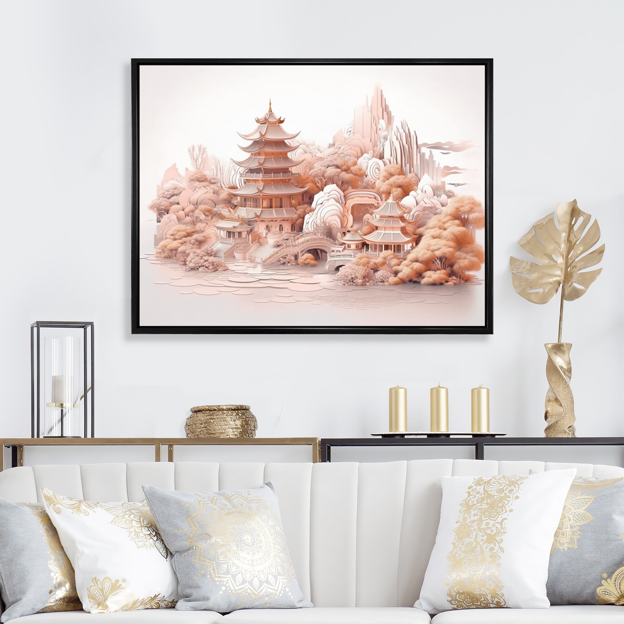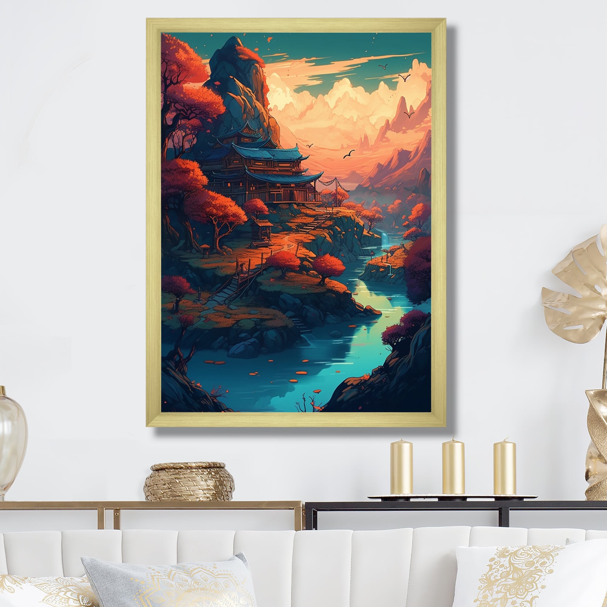 Designart "Mountain Top Asian Inspired Home I" Japon Landscape Framed Canvas Wall Art