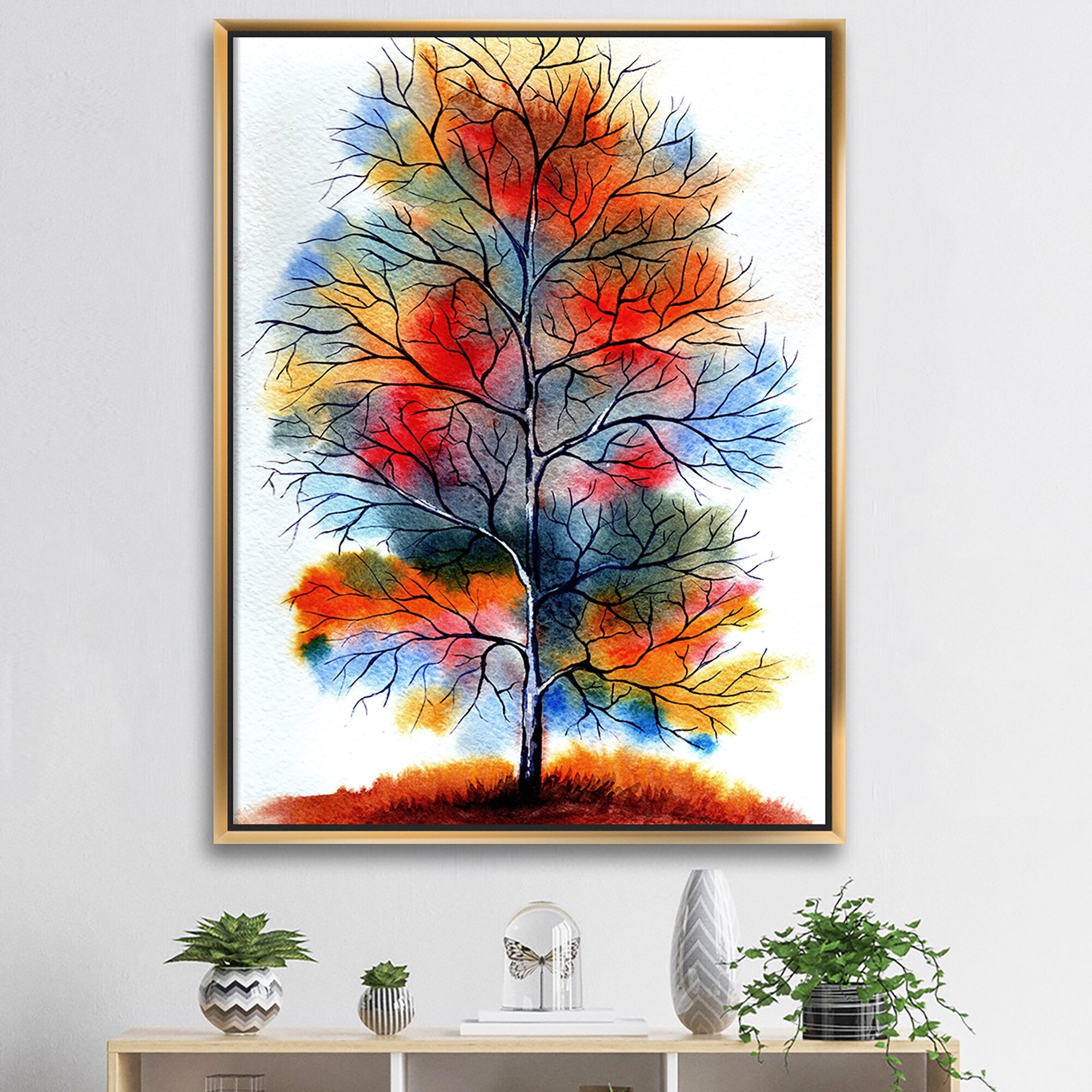 Designart "Red Autumn Artistic Forest" Traditional Framed artwork