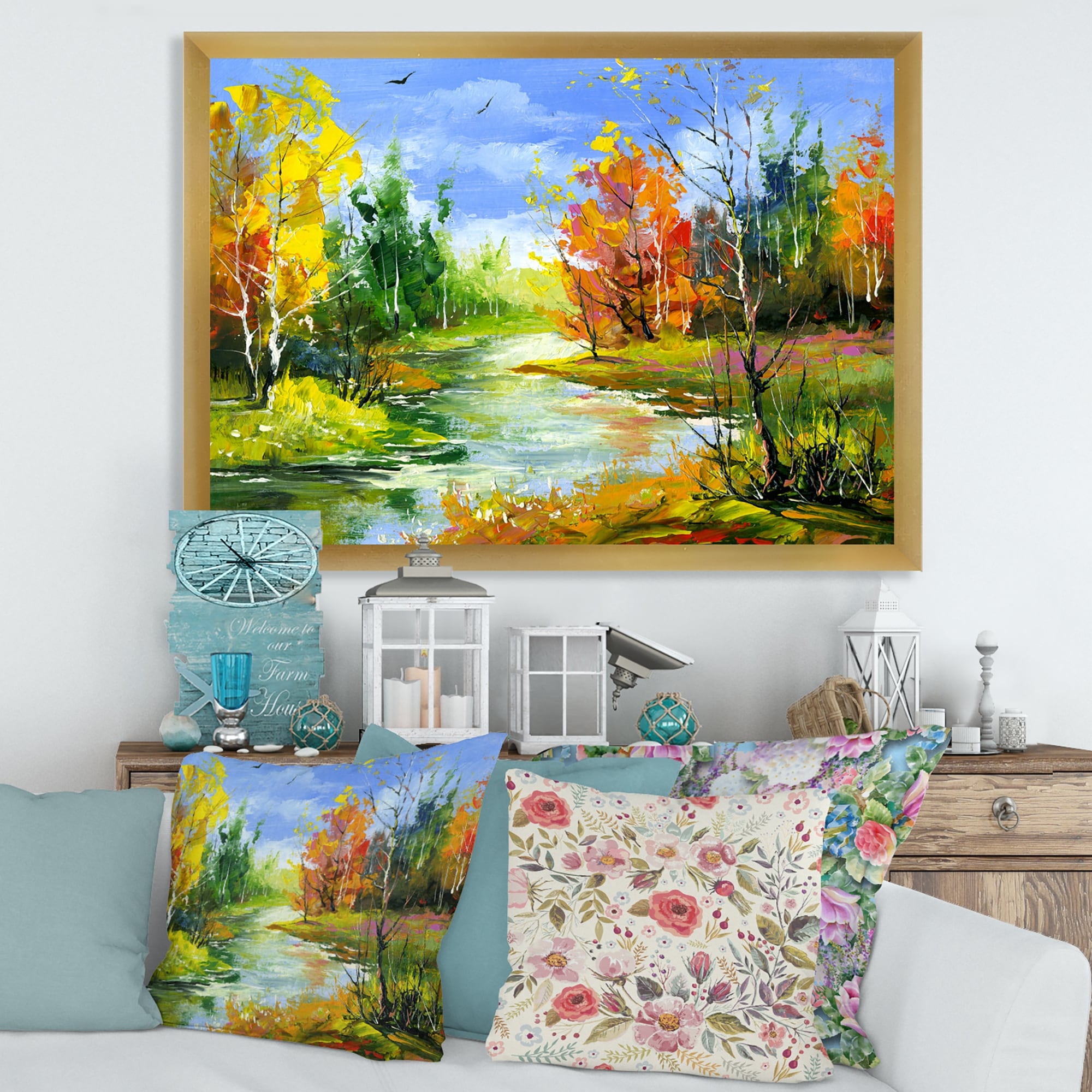 Designart "Autumn Landscape With the Wood River" Lake House Framed Art Print