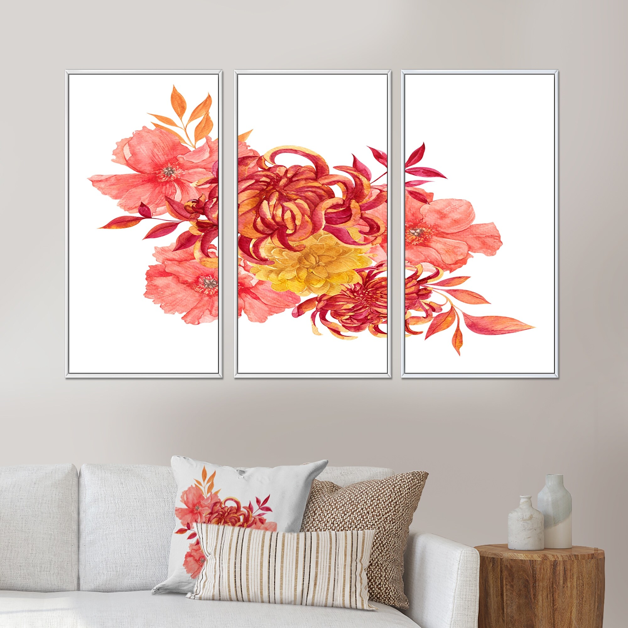 Designart "Red And Orange Autumn Bouquet on White" Traditional Framed Canvas Wall Art Set of 3 - 4 Colors of Frames