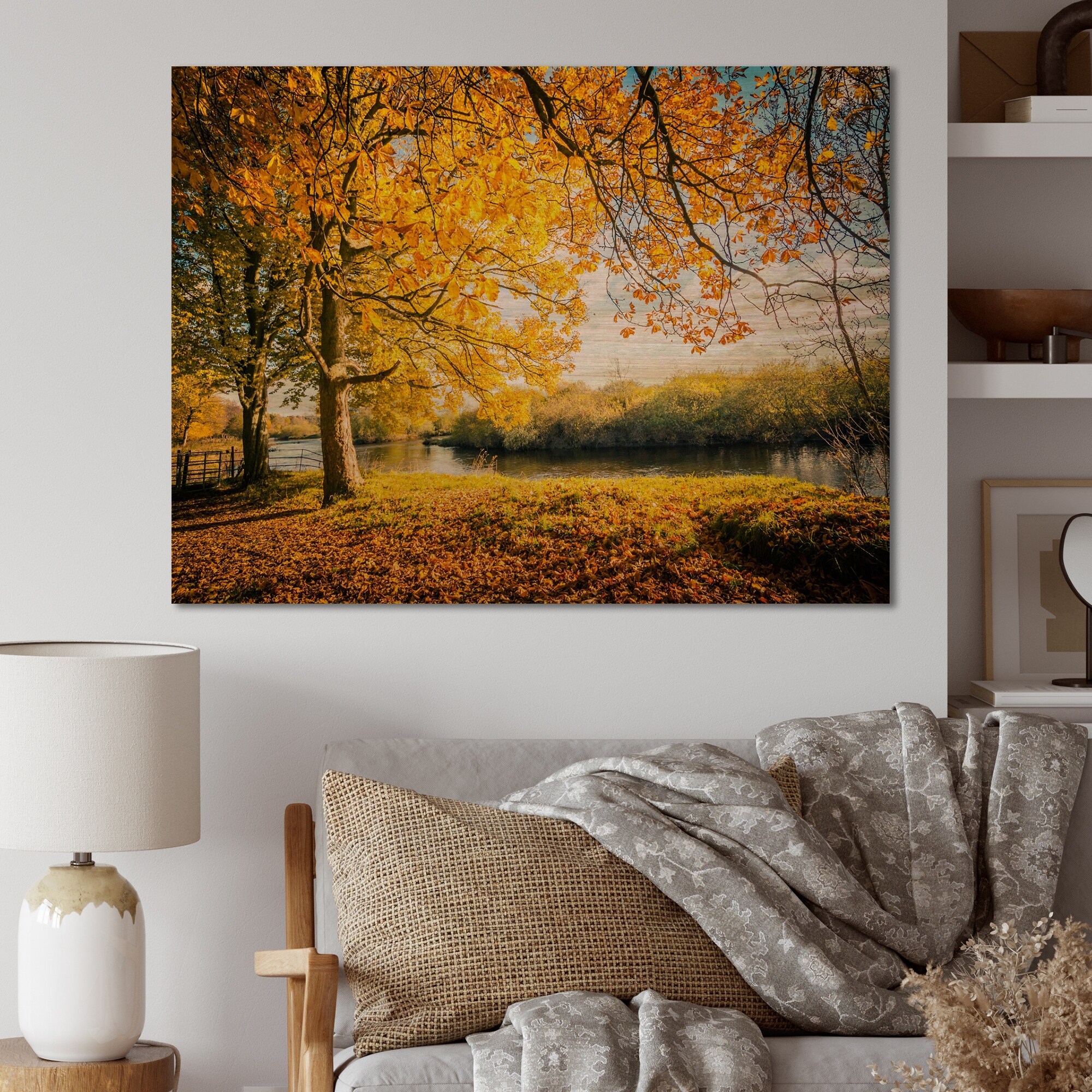 Designart 'Yellow Autumn Artistic Forest By the Lake III' Traditional Wood Wall Art Décor - Natural Pine Wood