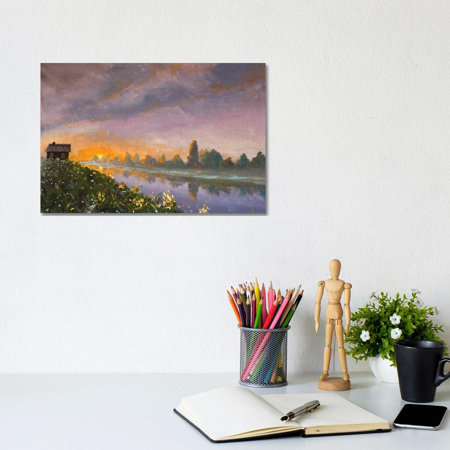 iCanvas "Old Rural Rustic Wooden House on River Bank At Dawn Sunset" by Valery Rybakow Canvas Print