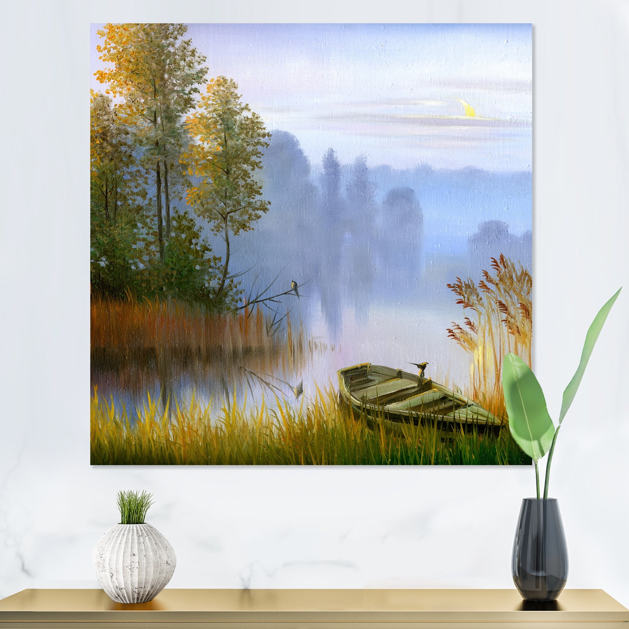 Designart "The Boat on the Bank of the Lake" Country Canvas Wall Art Print