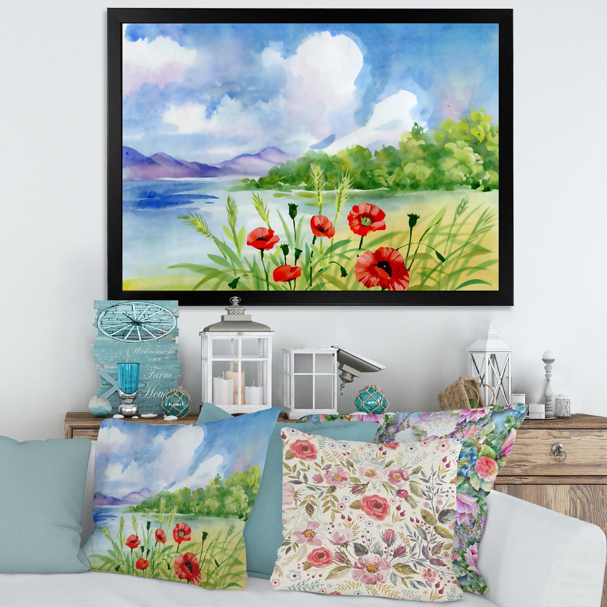 Designart "Red Tulips on the Bank Near A Mountain River" Lake House Framed Art Print