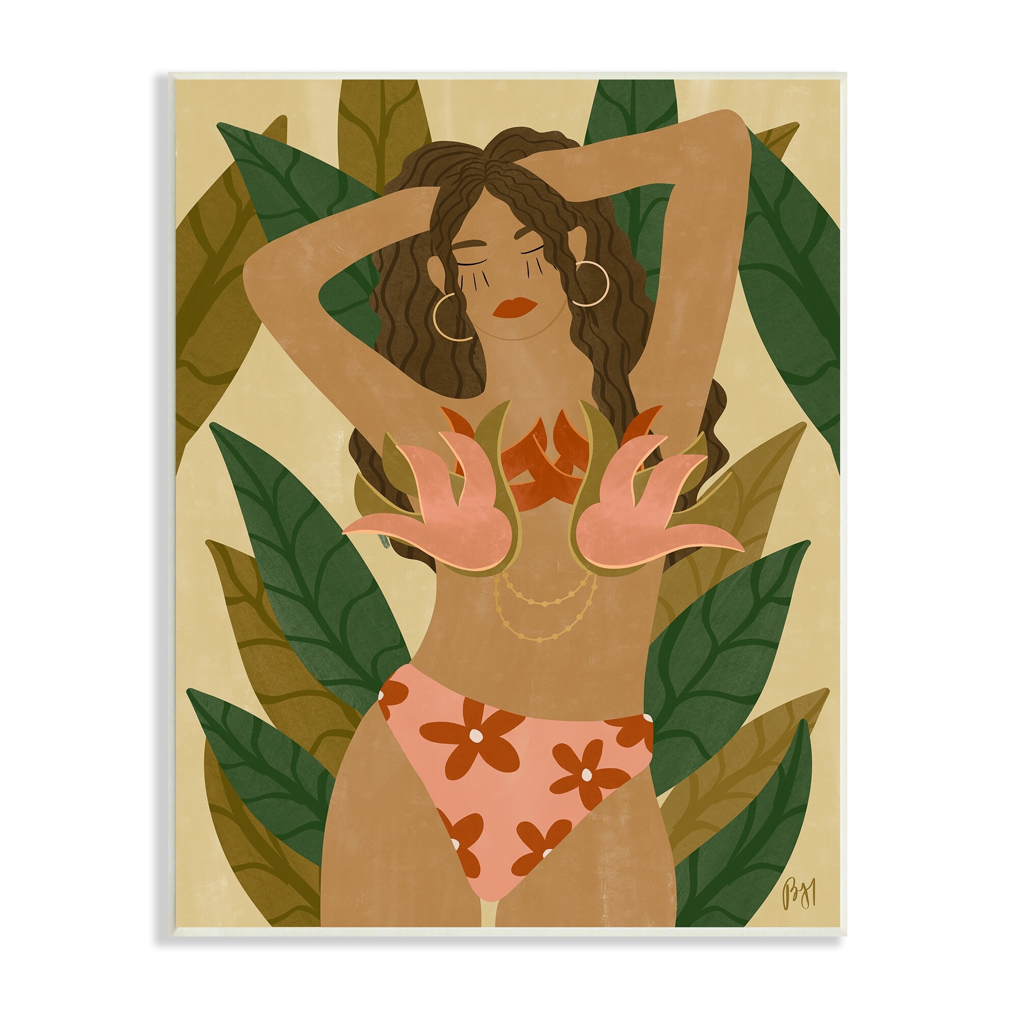 Stupell Female in Fierce Pink Bikini Over Tropical Plants Wood Wall Art - Green