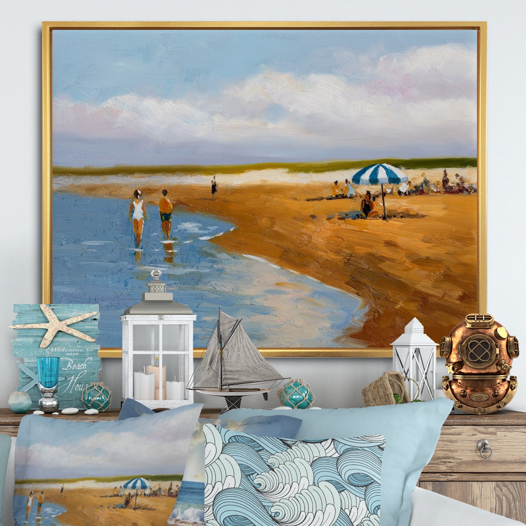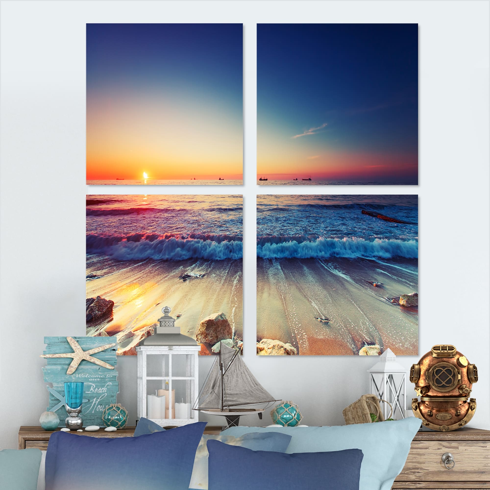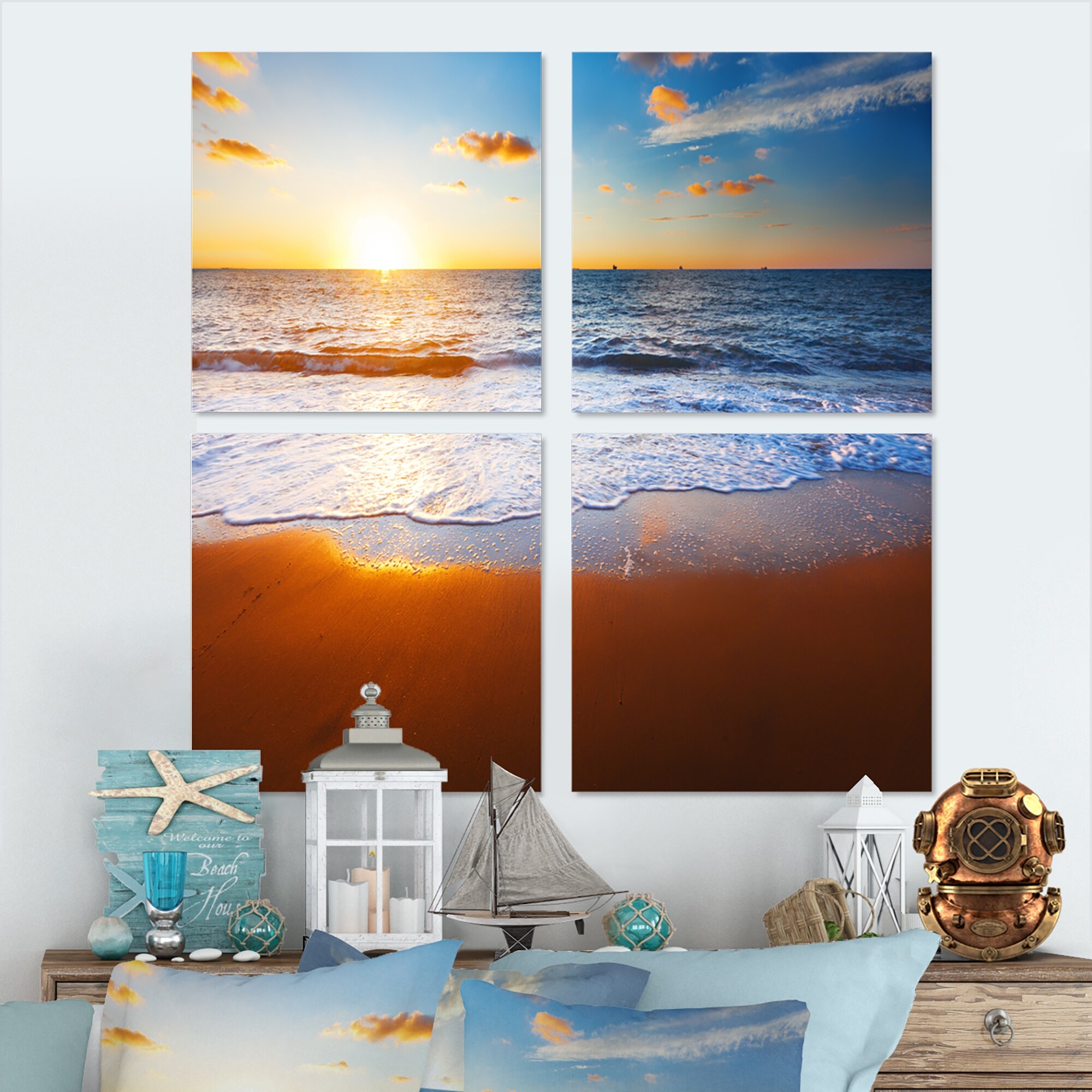 Designart "Sunset On Beautiful Sand Beach With Blue Sea Water" Nautical & Coastal Framed Canvas Wall Art Print