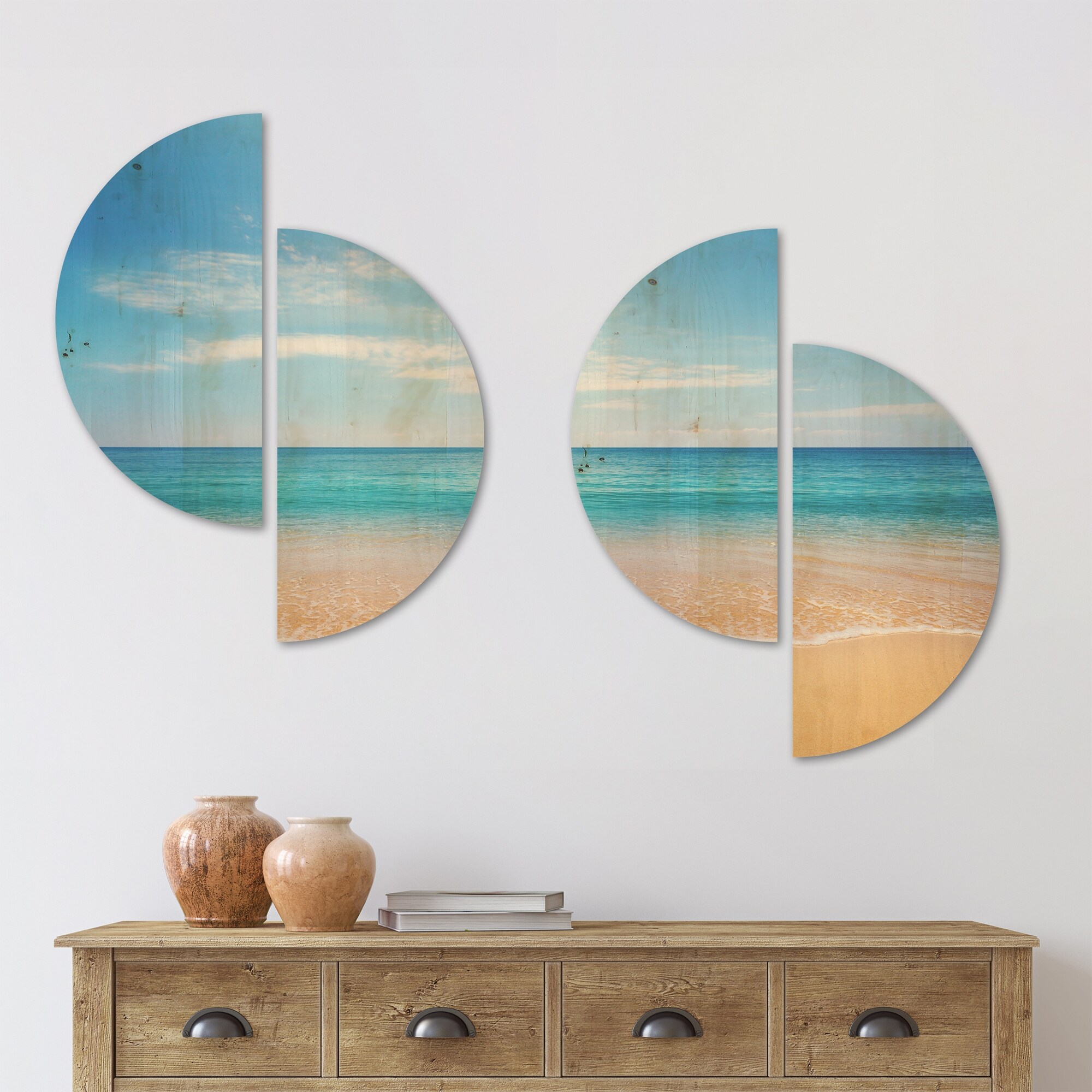 Designart 'Calm Blue Sea and Sky' Seashore Wood Wall Art Set of 4 Half Circles