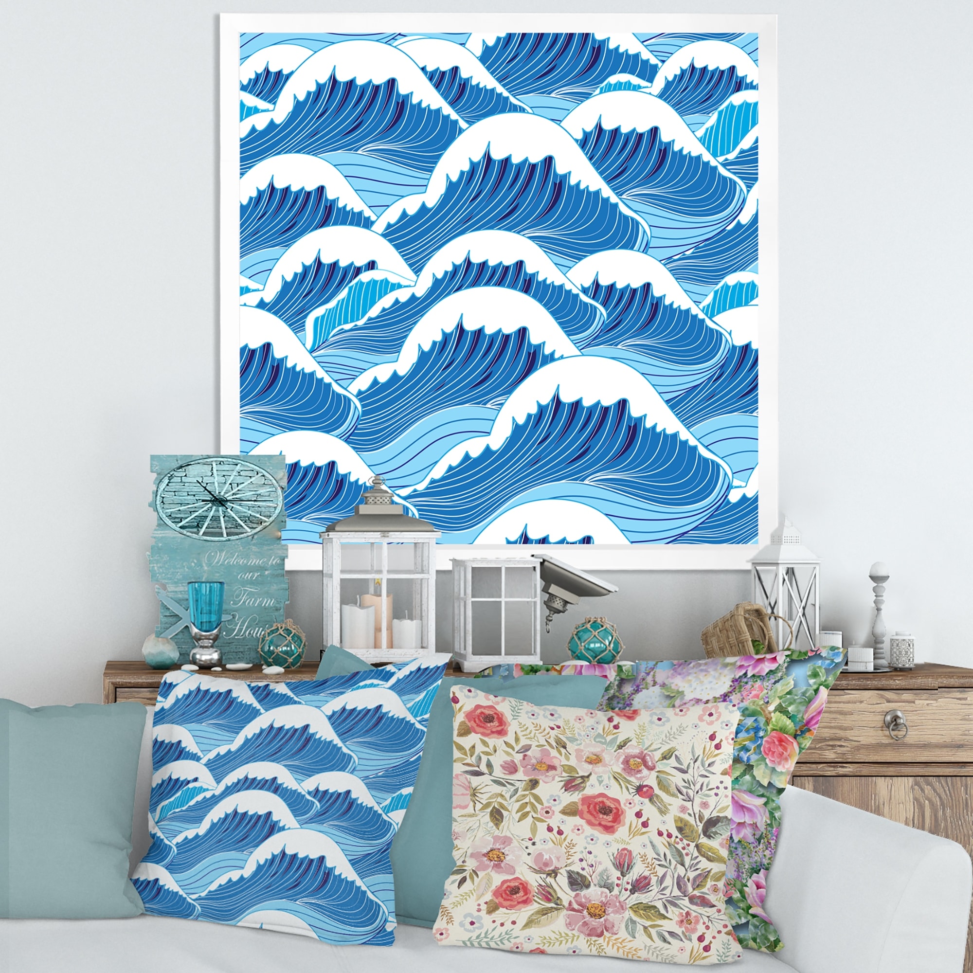 Designart "Coast Blue Sea Waves Watercolour" Modern Farmhouse Framed Canvas