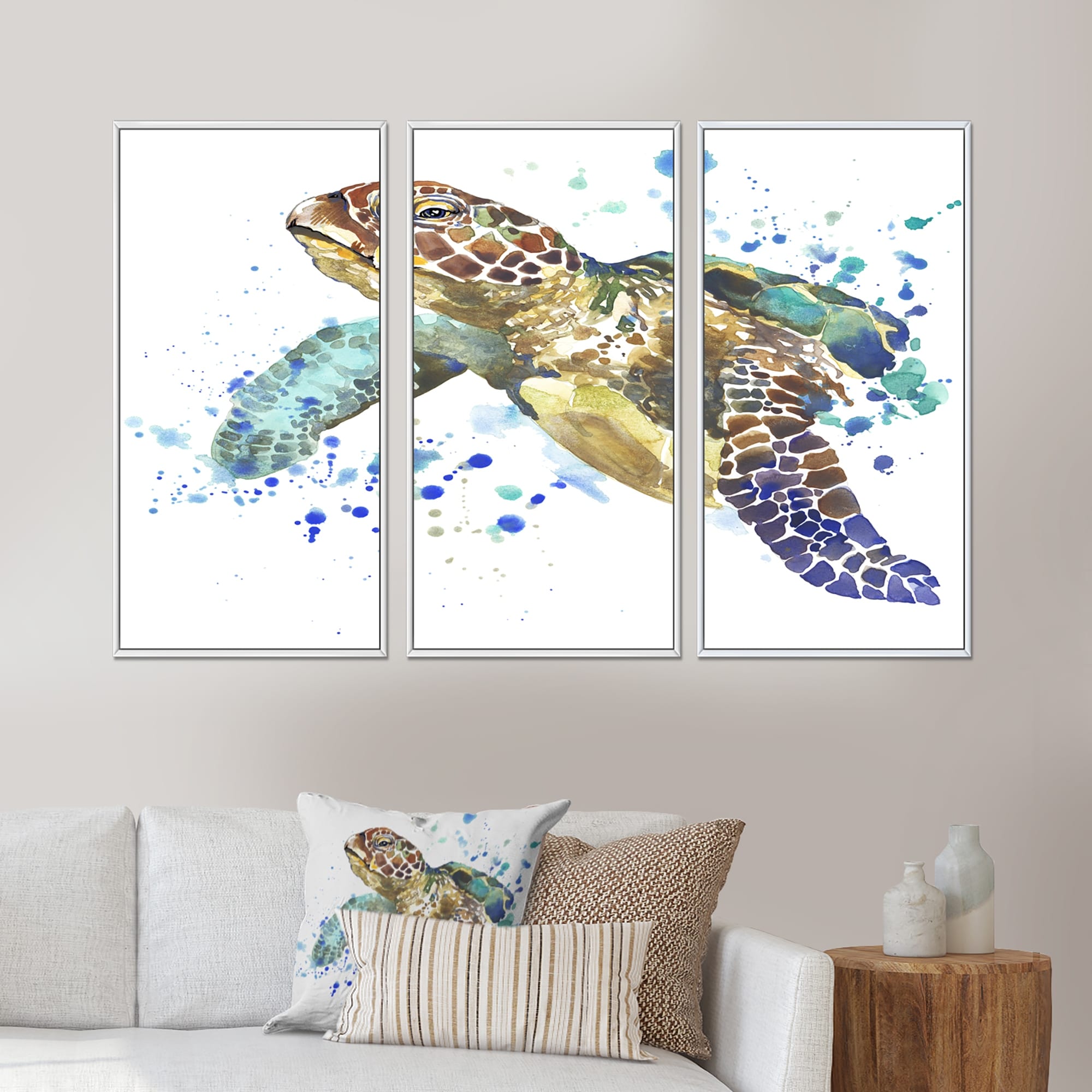 Designart "Blue Sea Turtle" Animal Framed Canvas Wall Art Print Set of 3 - 4 Colors of Frames