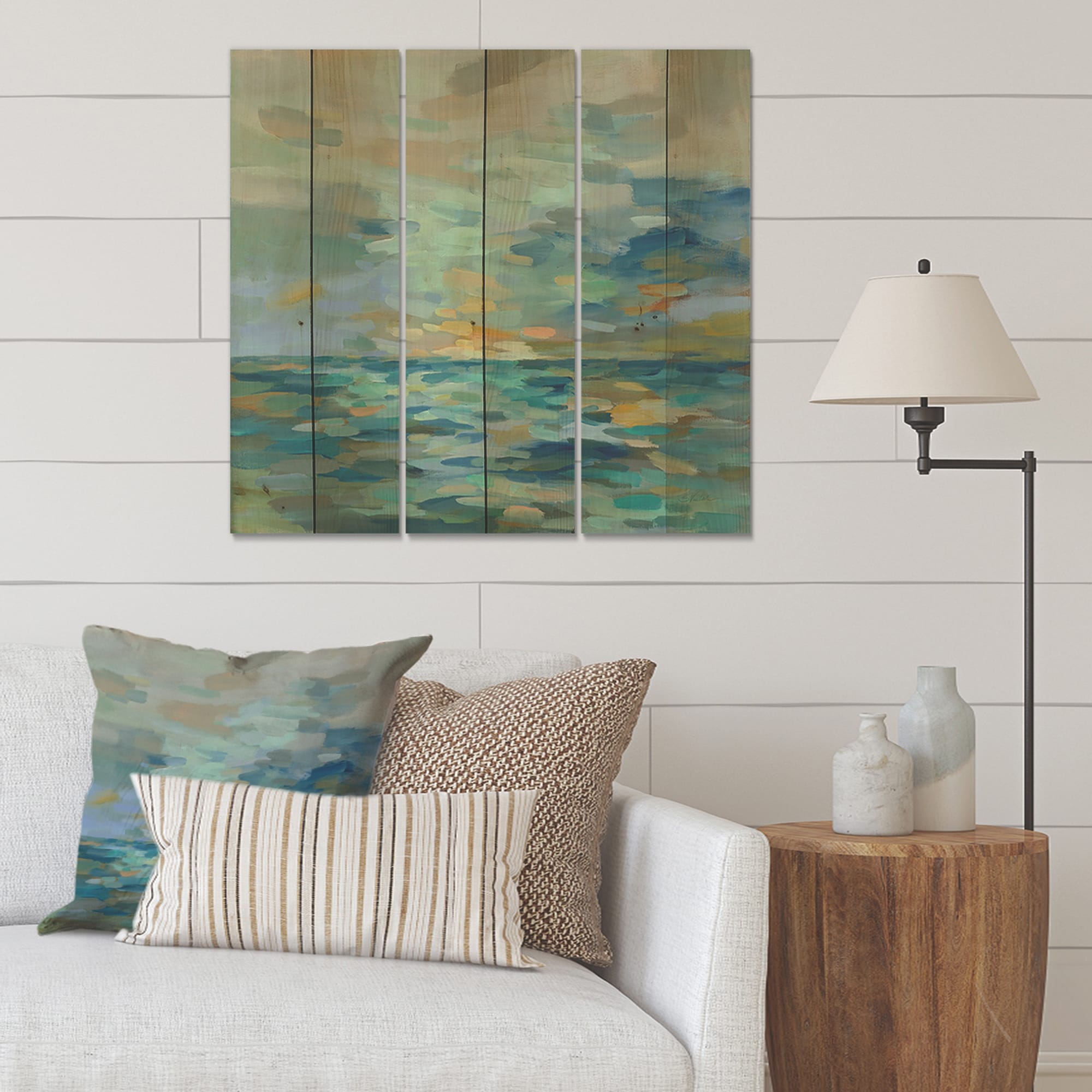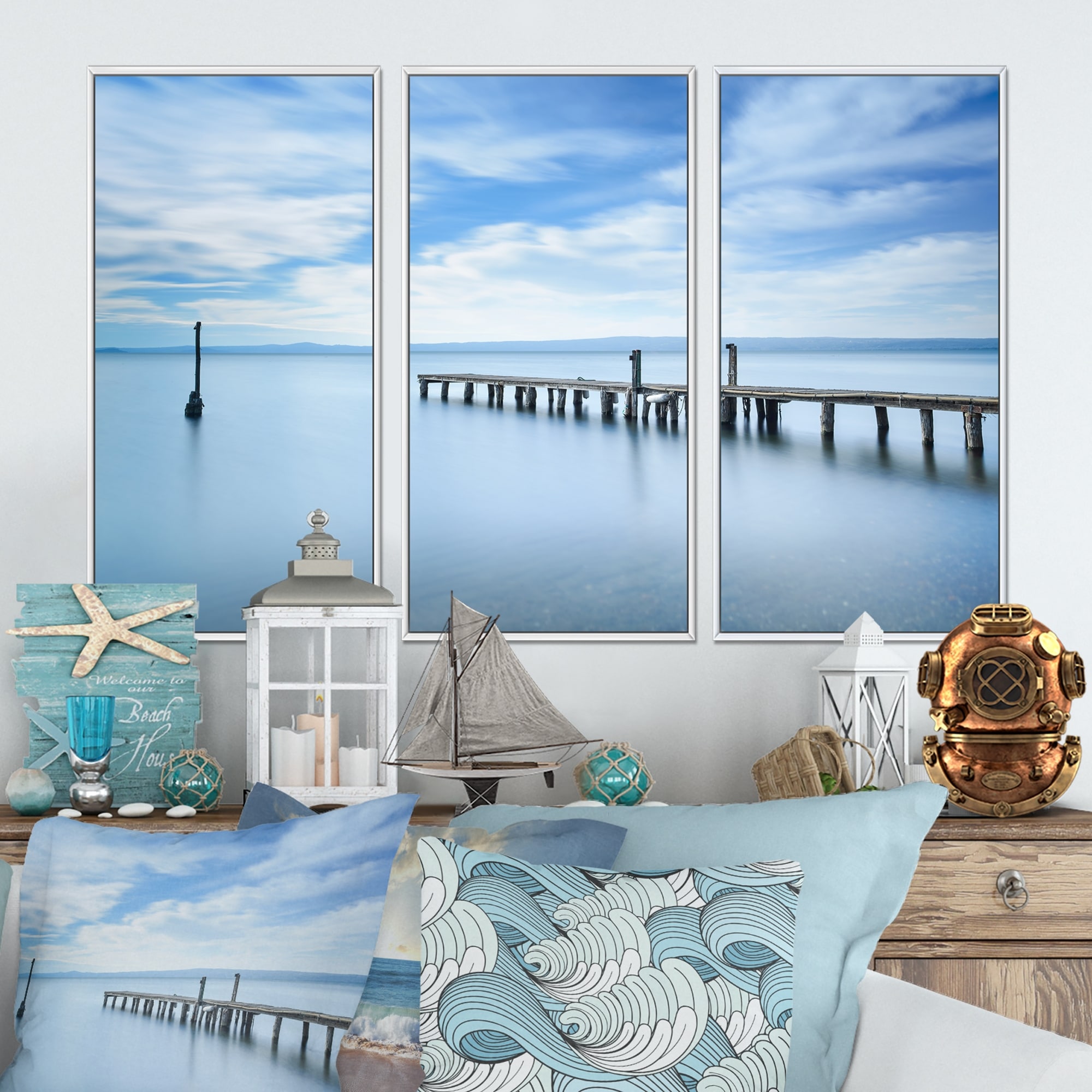 Designart 'Pastel Blue Sea' Cottage Print on Natural Pine Wood - 3 Panels