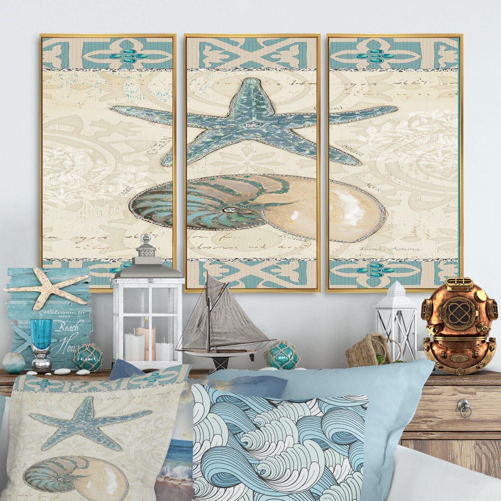 Designart "Seastar and Blue Sea Shell I" Nautical & Coastal Framed Wall Art Set of 3 - 4 Colors of Frames