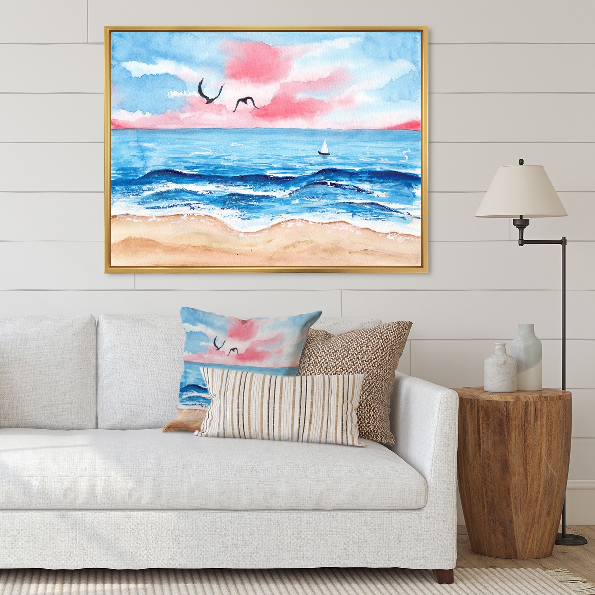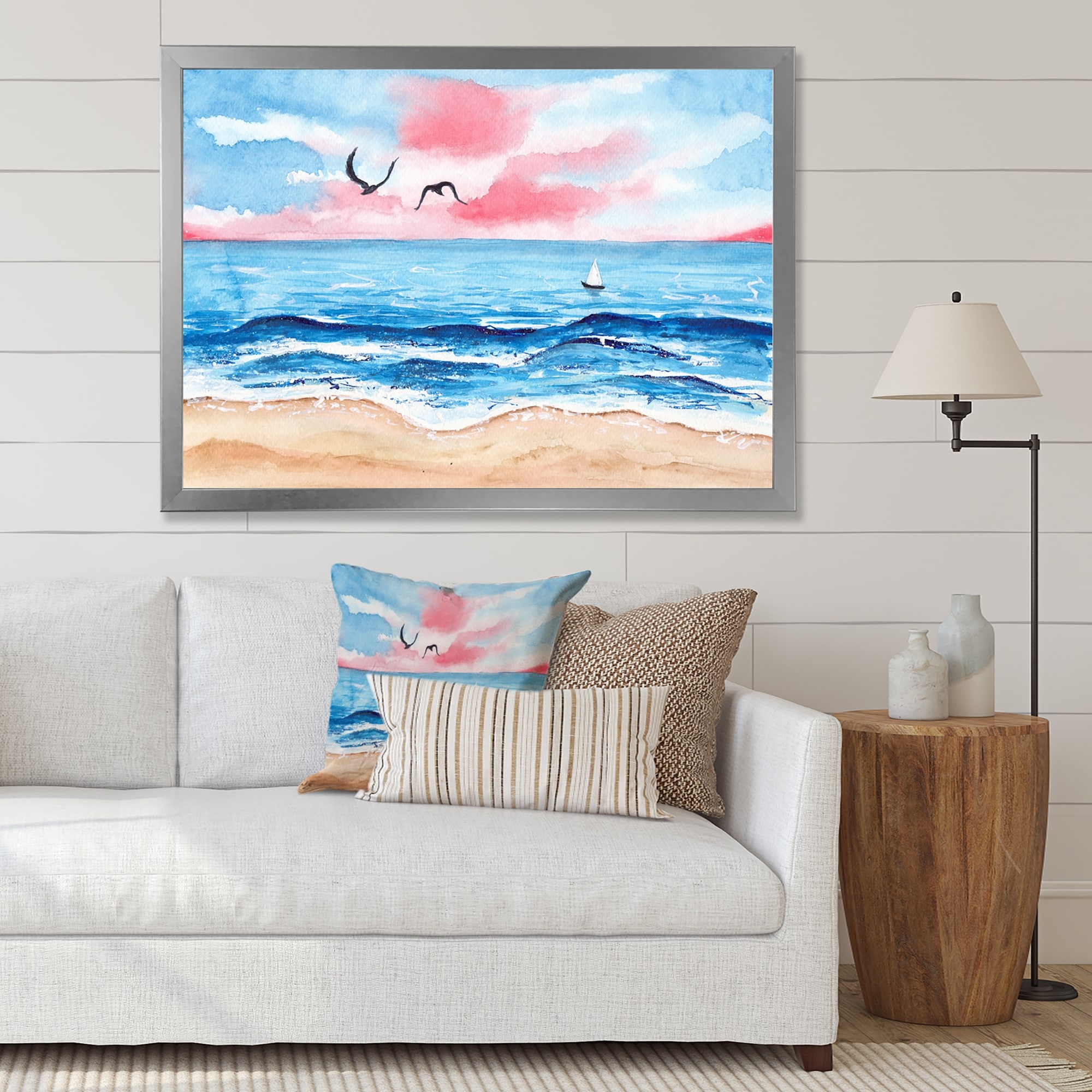Designart "Sunset over Blue Sea Watercolor" Landscape Framed Canvas Wall Art
