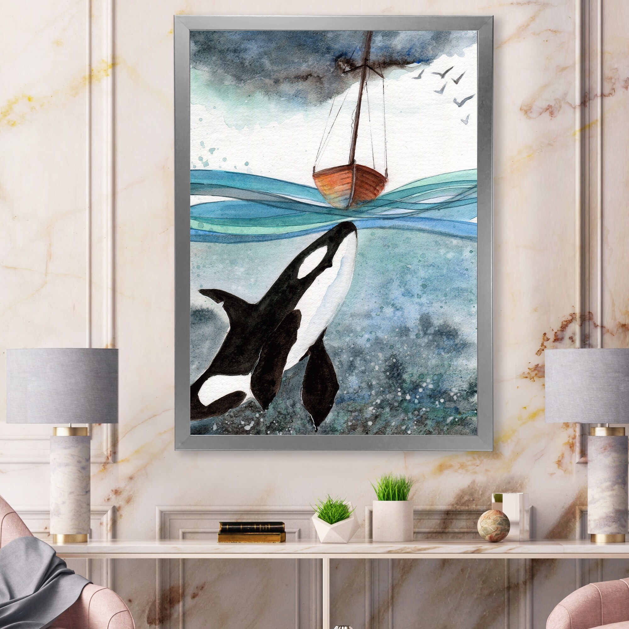 Designart "Orca In the Blue Sea" Nautical & Coastal Framed Art Print