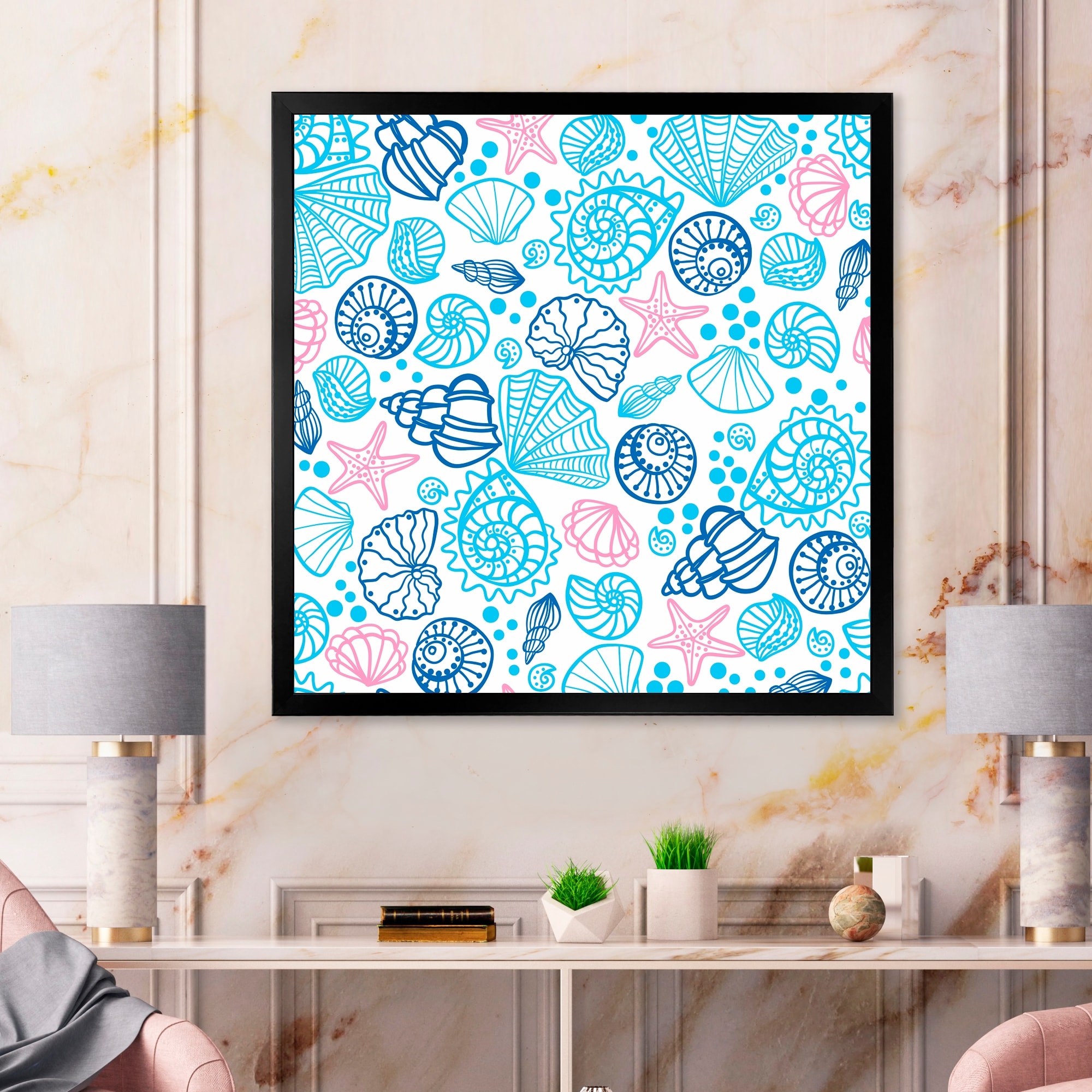 Designart "Red Sea Stars With Blue Seashells" Patterned Framed Art Print