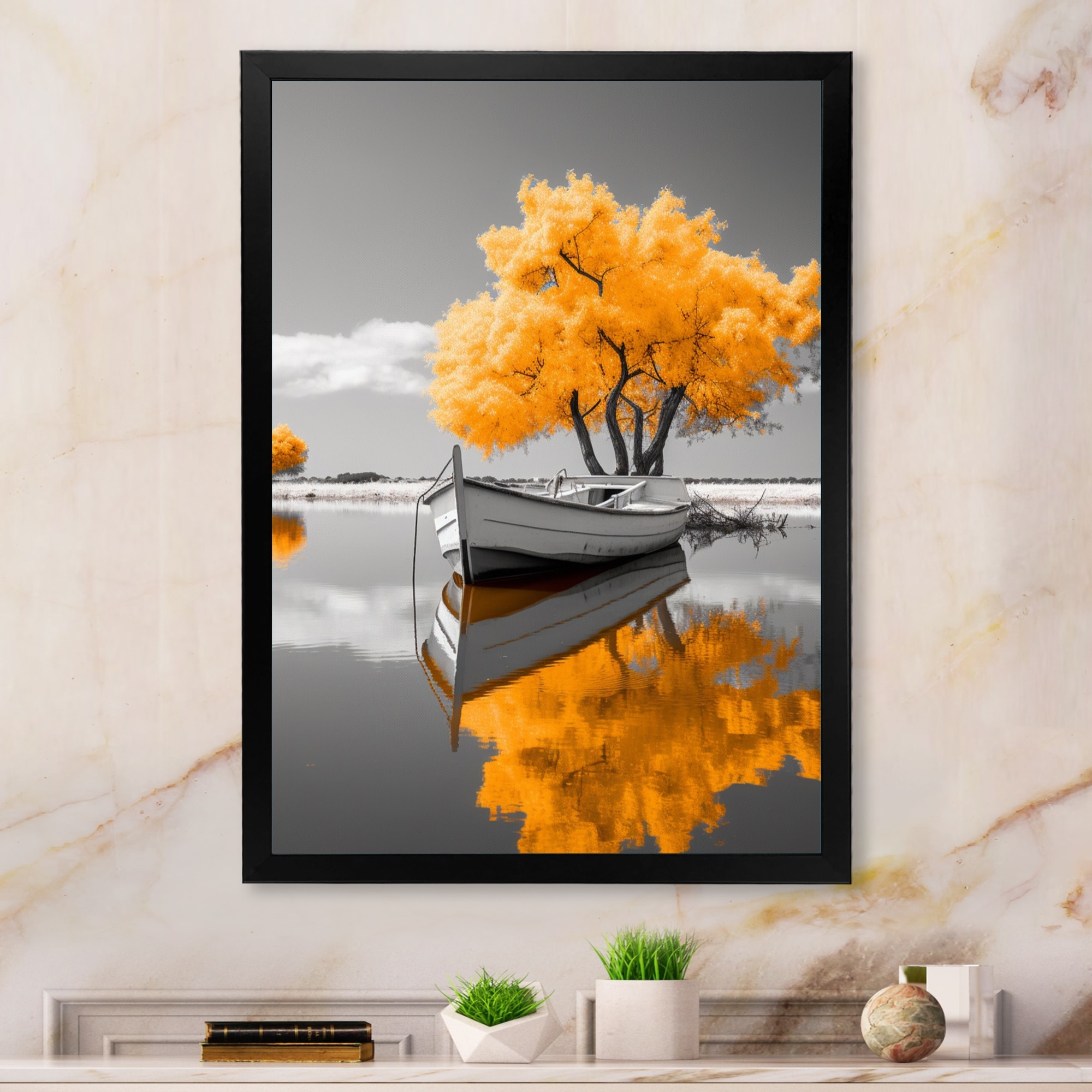 Designart "Monochrome Yellow Boat Reflections I" Boat Framed Canvas Art Print