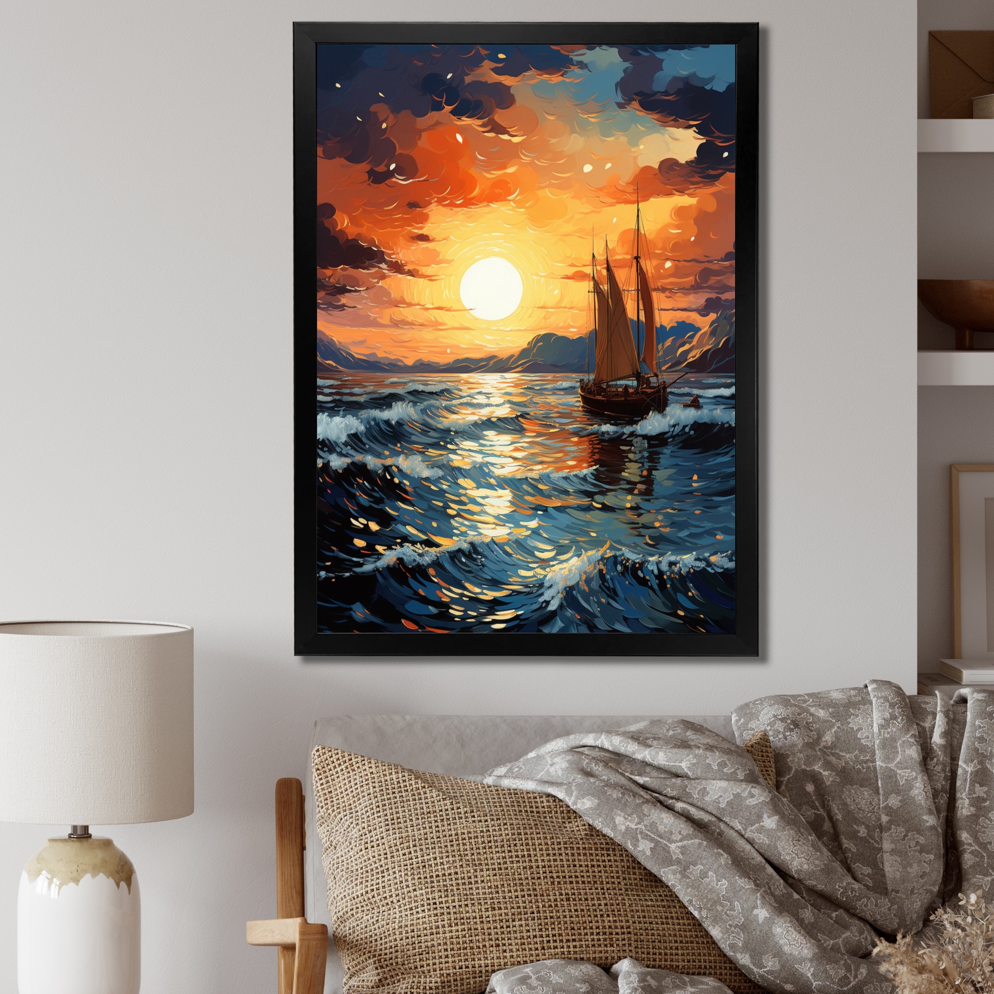 Designart "Sailboat During Exotic Sunset V" Coastal Boat Framed Canvas Wall Art Print
