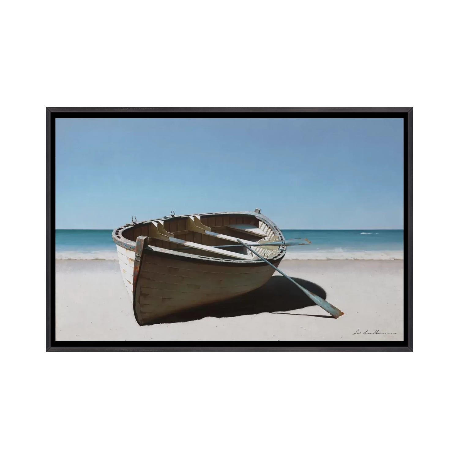 "Boat moored on the beach" Black Float Frame Canvas Art