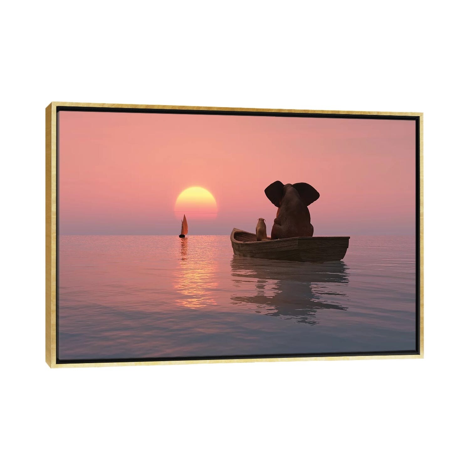 iCanvas "Elephant And Dog Are Floating in A Boat At Sunset" by Mike Kiev Framed Canvas Print