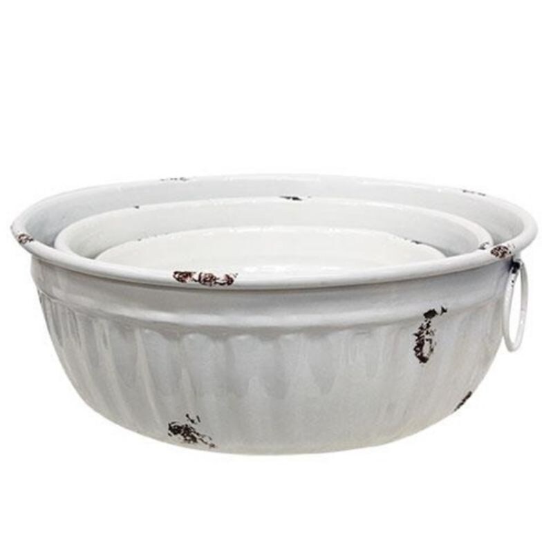 3/Set Distressed White Metal Bowls w/Handles - 12" dia x 5"H