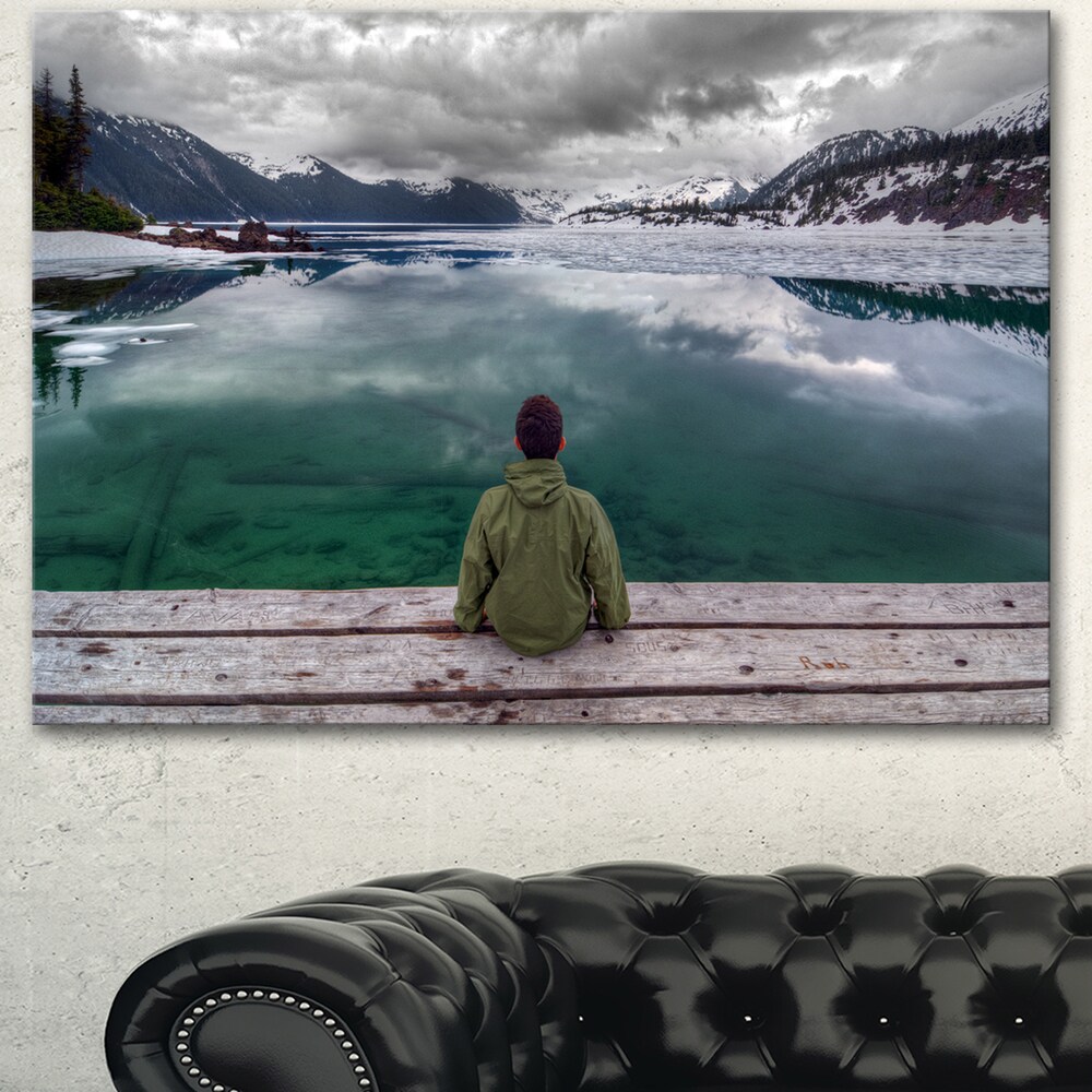 Designart "Boy Looking at Clear Mountain Lake" Landscape Artwork Canvas Print - White