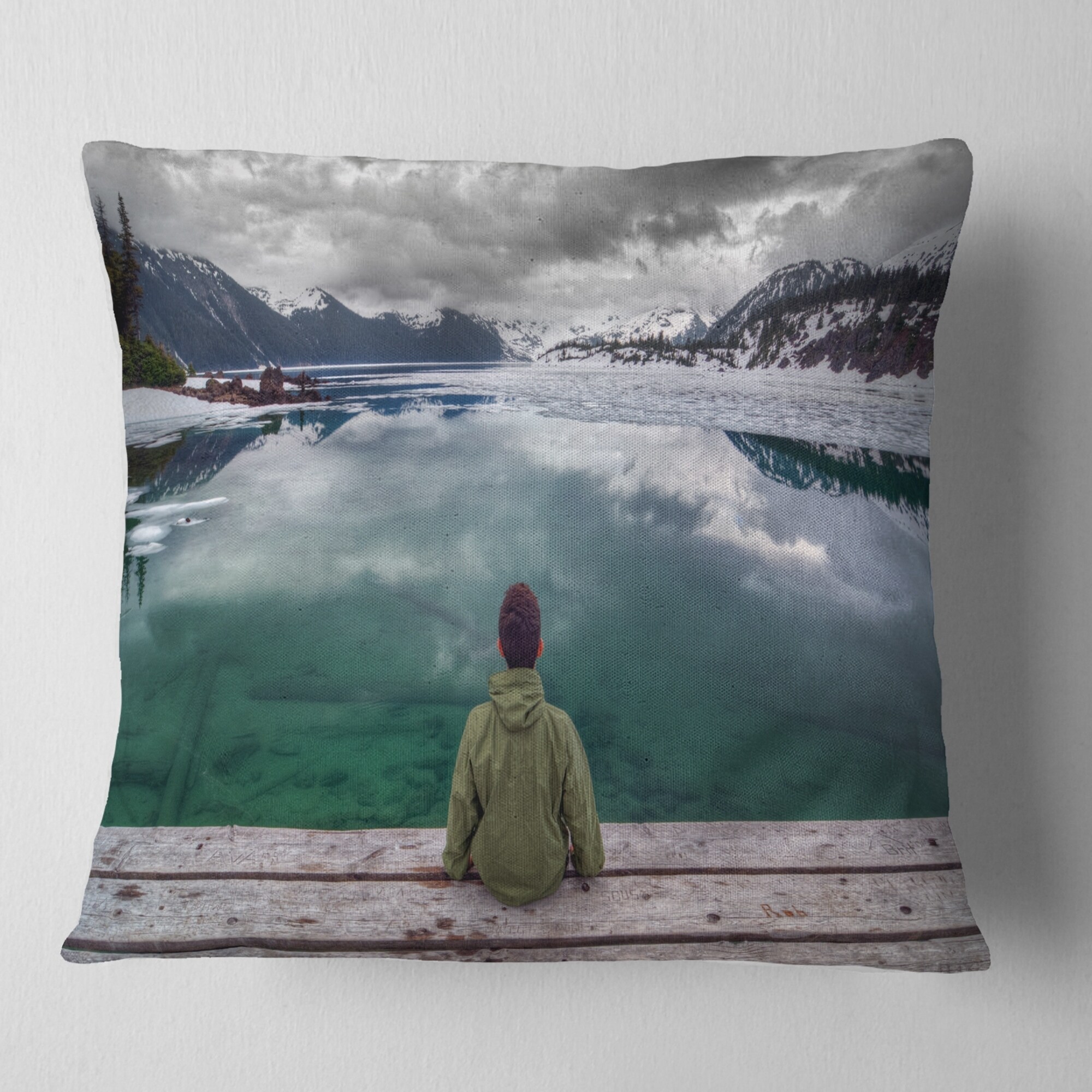 Designart 'Boy Looking at Clear Mountain Lake' Landscape Printed Throw Pillow