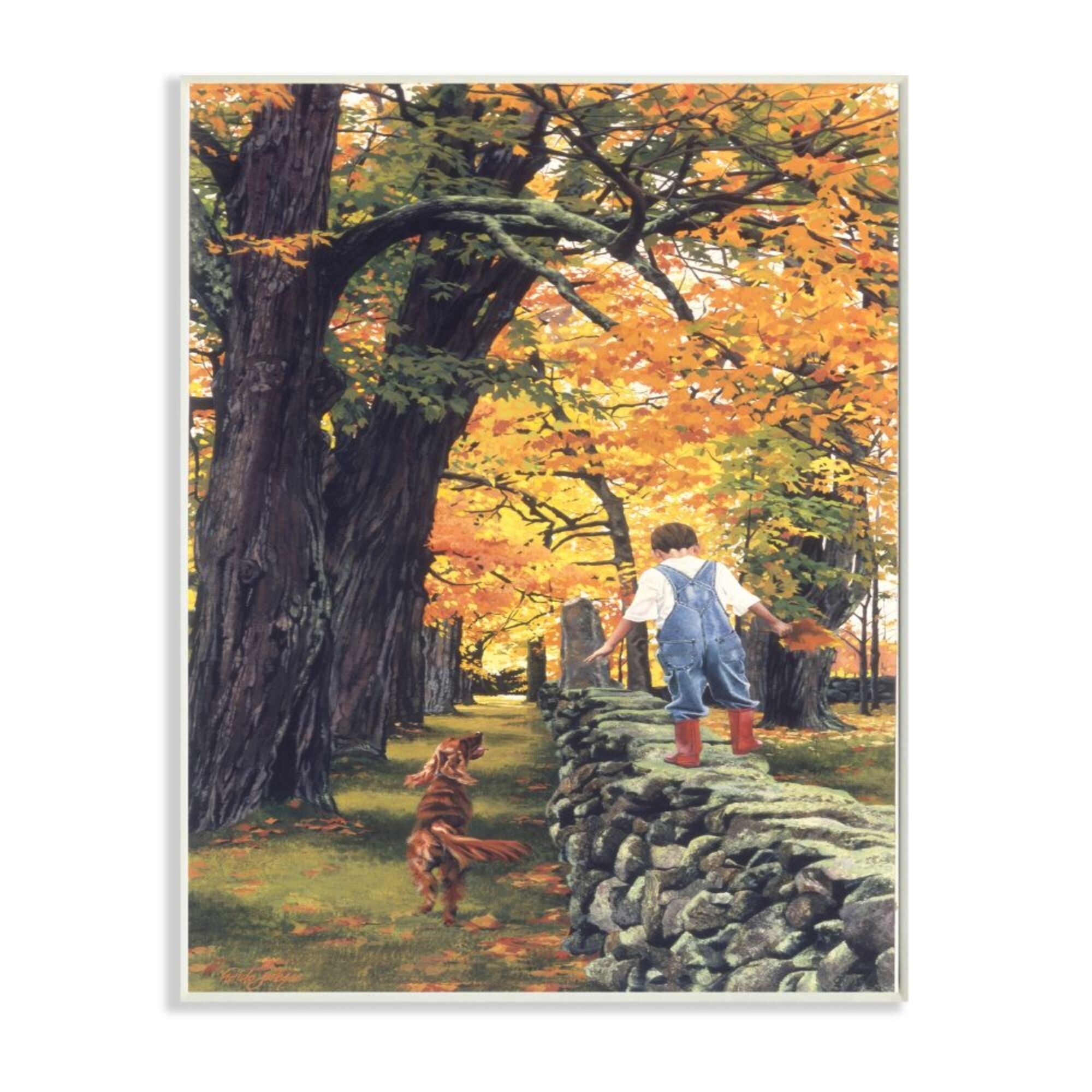 Stupell Boy Walking on Stone Wall with Dog Wood Wall Art