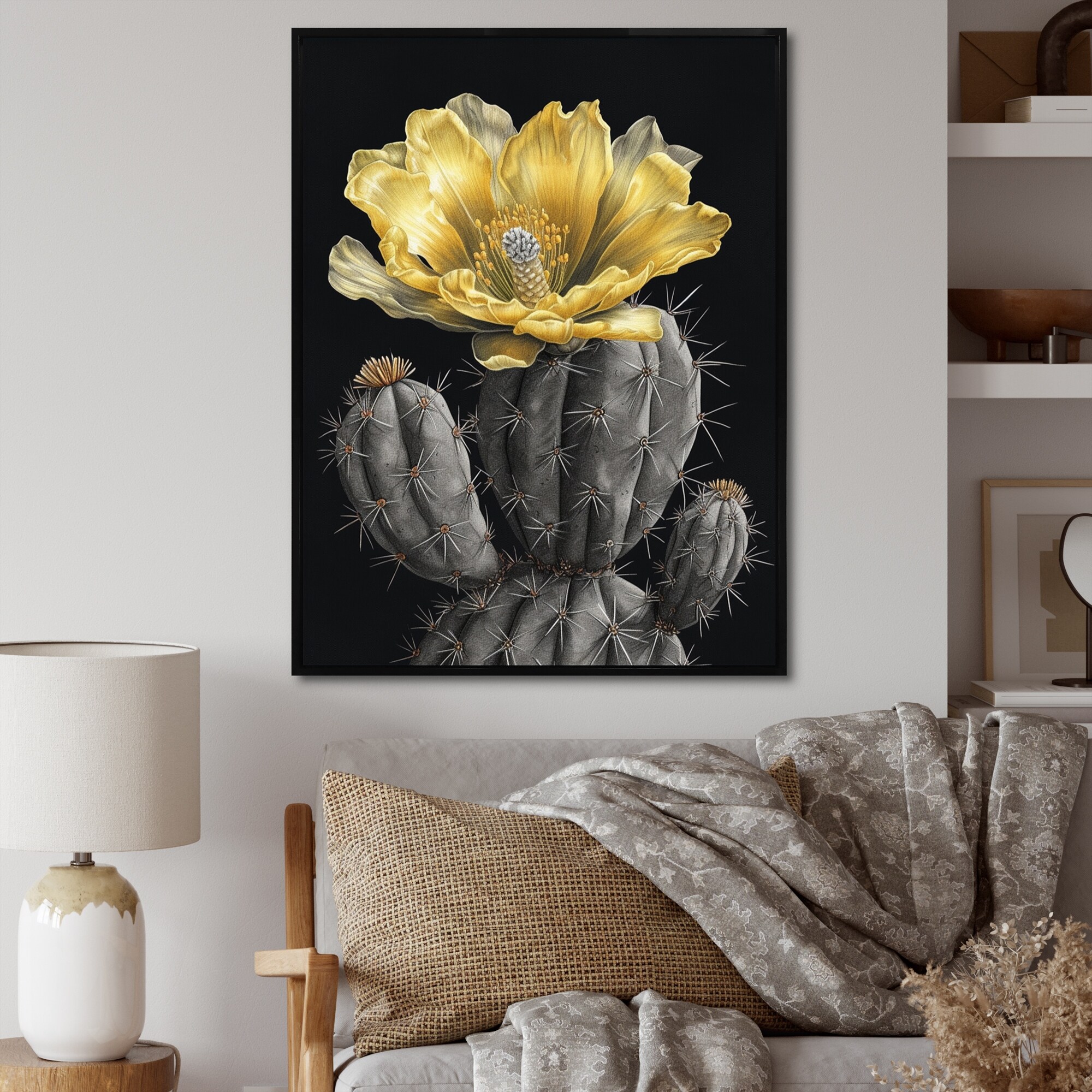 Designart "Yellow Grey Cactus Scenery" Floral Cactus Framed Wall Decor