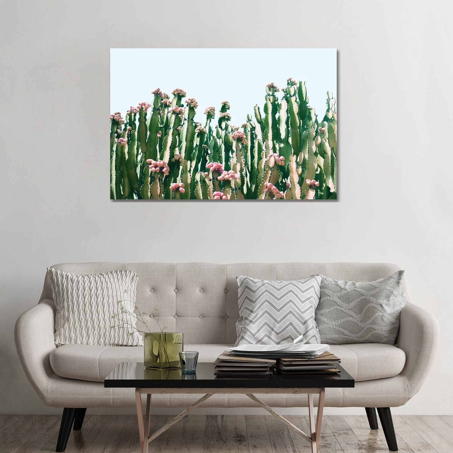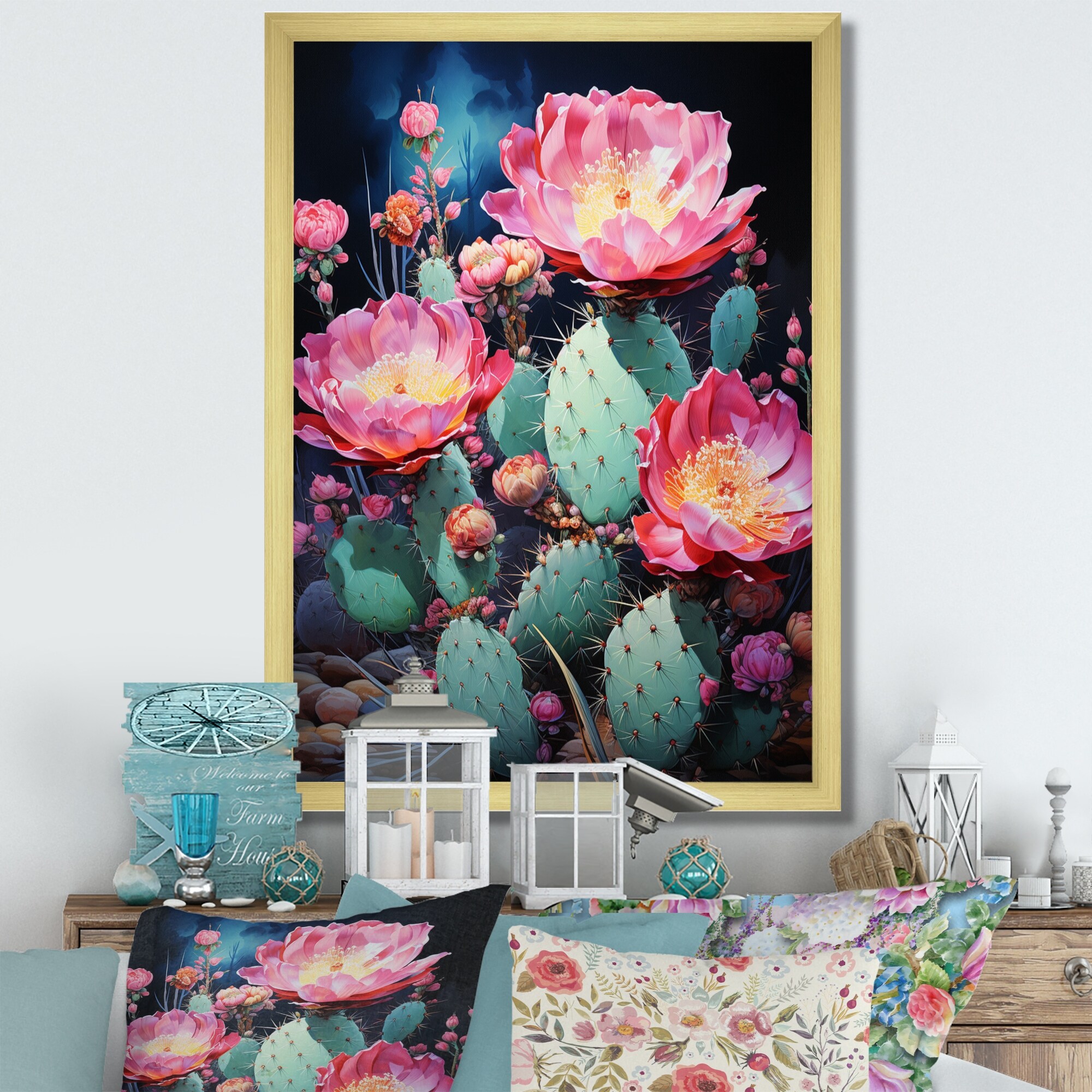Designart "Pink Green Cactus Scenery" Floral Cactus Framed Canvas Print