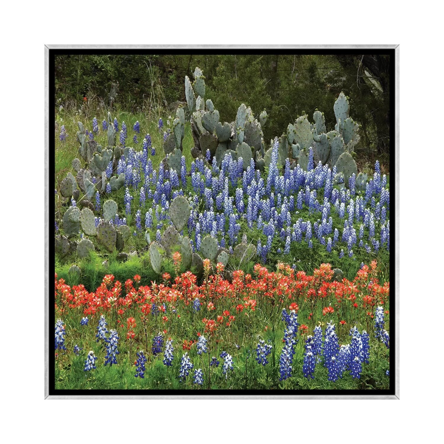iCanvas "Bluebonnet, Paintbrush Cactus, Texas And Pricky Pear - Horizontal" by Tim Fitzharris Framed