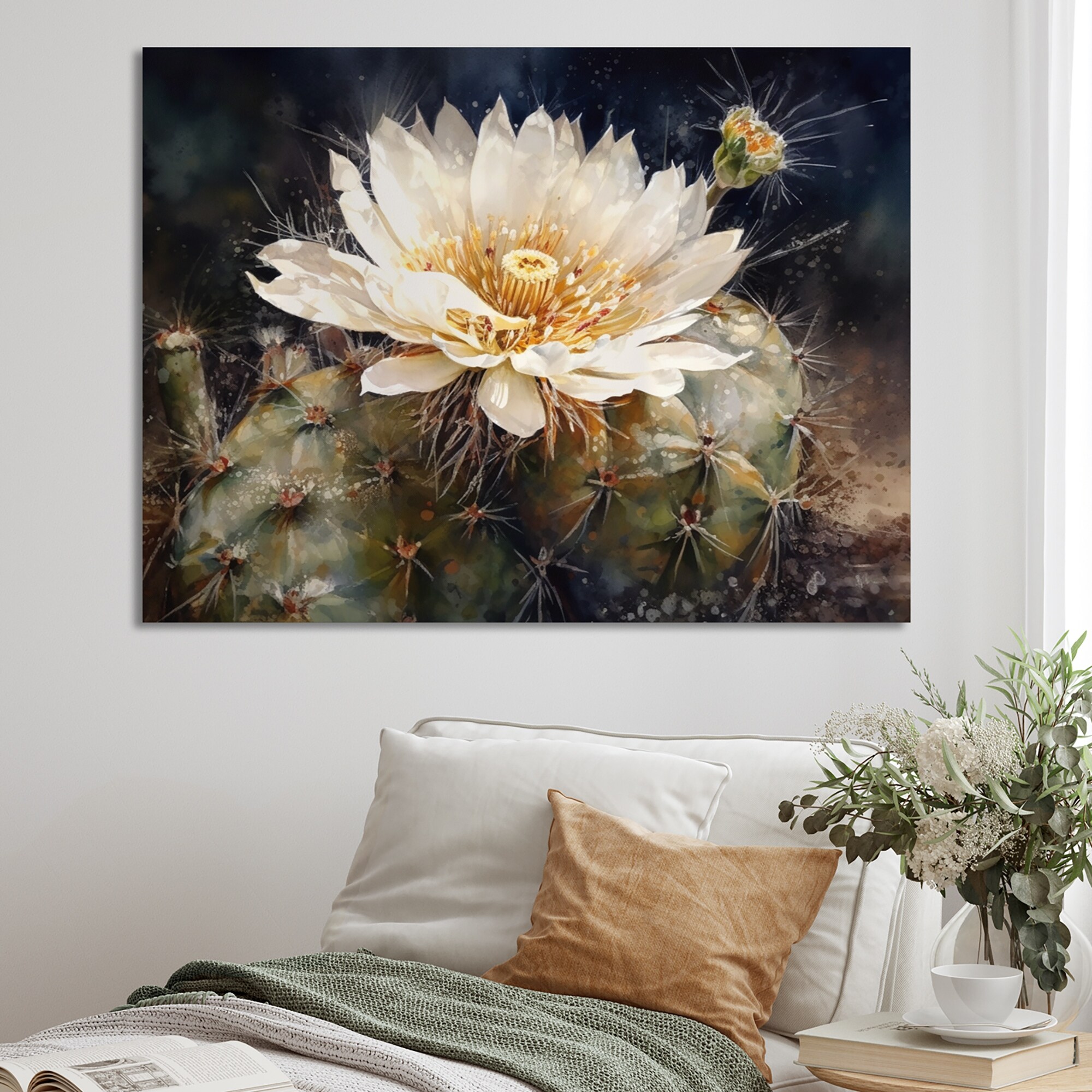 Designart "White Green Cactus Flower I" Floral Cactus Wall Decor