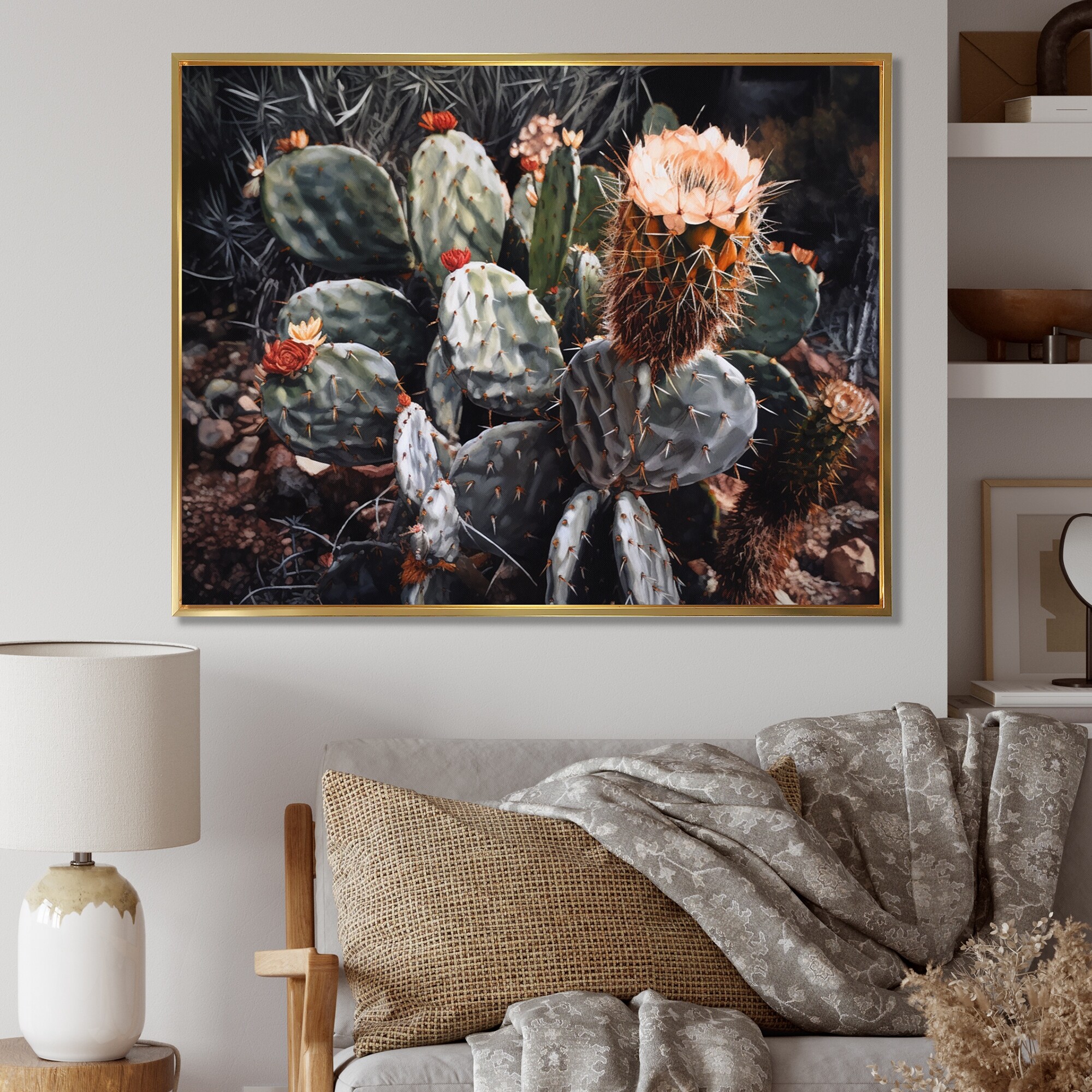 Designart "Coral Green Cactus Desert Royalty Queen" Cactus Framed Canvas Art Print