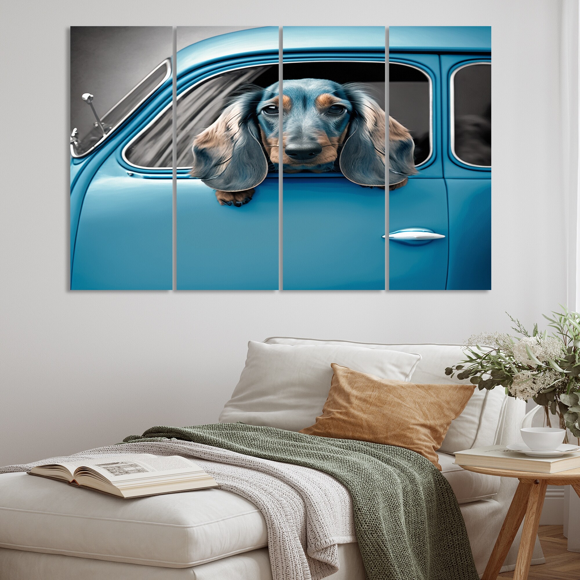 Designart "Portrait Of a Dachshund in A Blue Car I" Animals Dog Daschund Multipanel Wall Decor