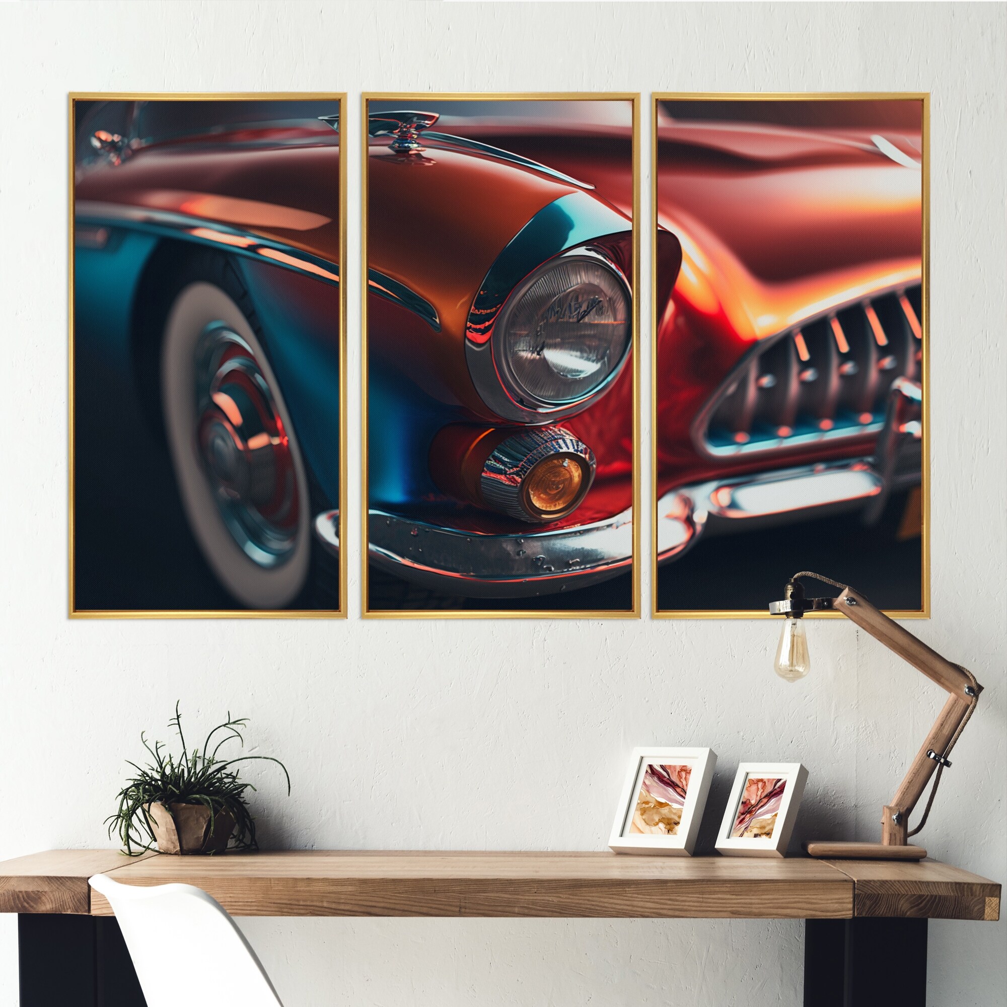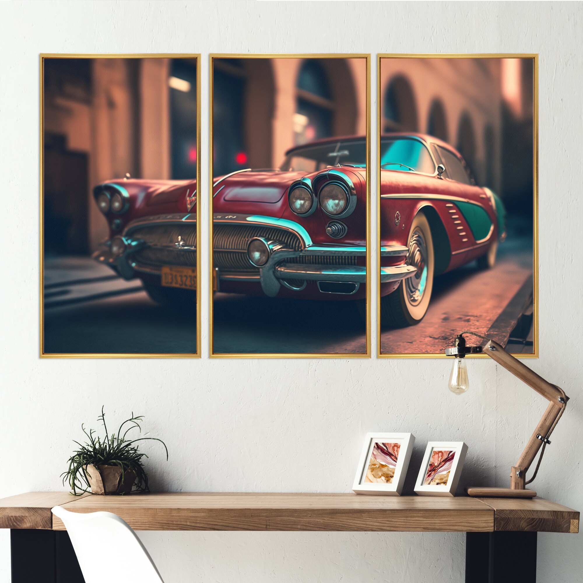 Designart "Vintage Retro Car During Golden Hour VI" Retro Car Framed Canvas Wall Art Print - 3 Panels