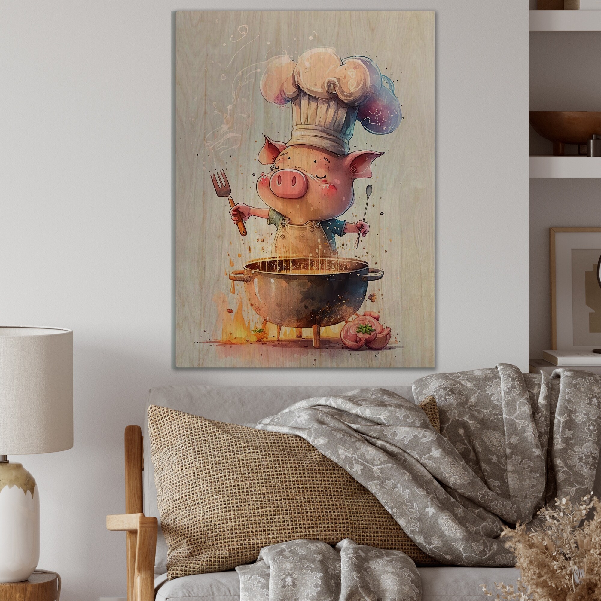 Designart 'Cute Pig With Chef Hat II' Animals Pig Wood Wall Art - Natural Pine Wood
