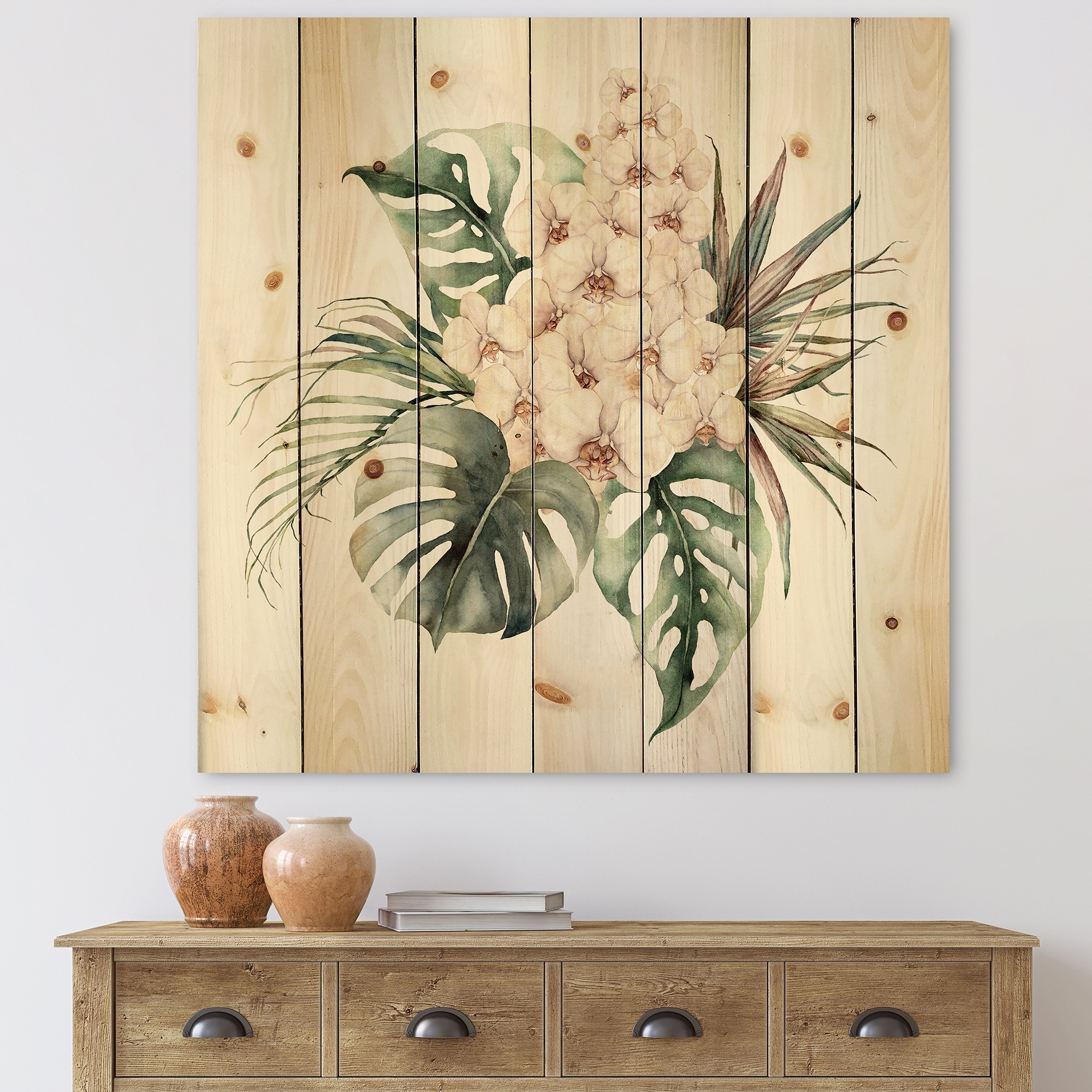 Designart 'Bouquet With Orchids Monstera and Coconut Leaves' Traditional Print on Natural Pine Wood