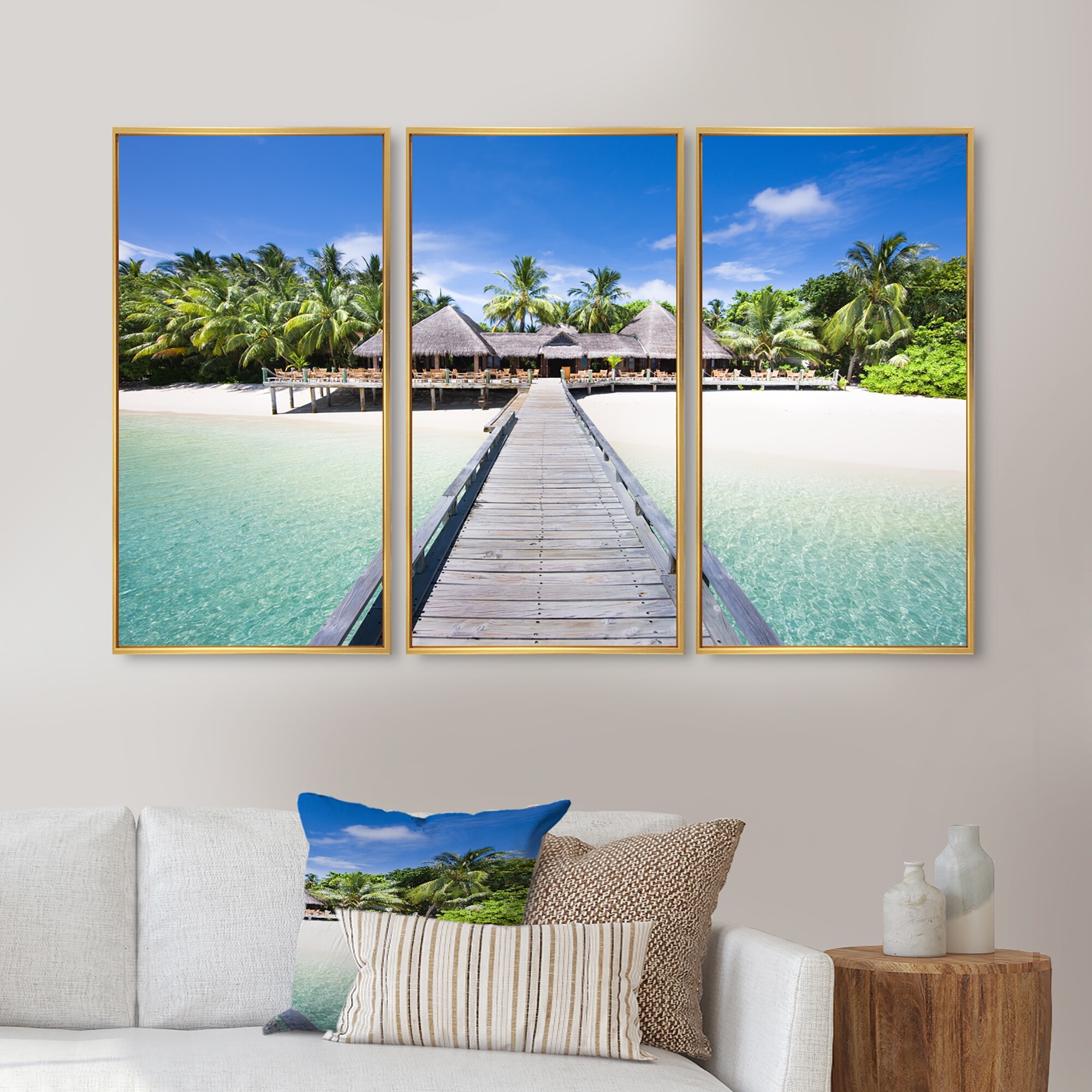Designart "Beach with Coconut Palm Trees" Landscape Framed Wall Decor Set of 3 - 4 Colors of Frames