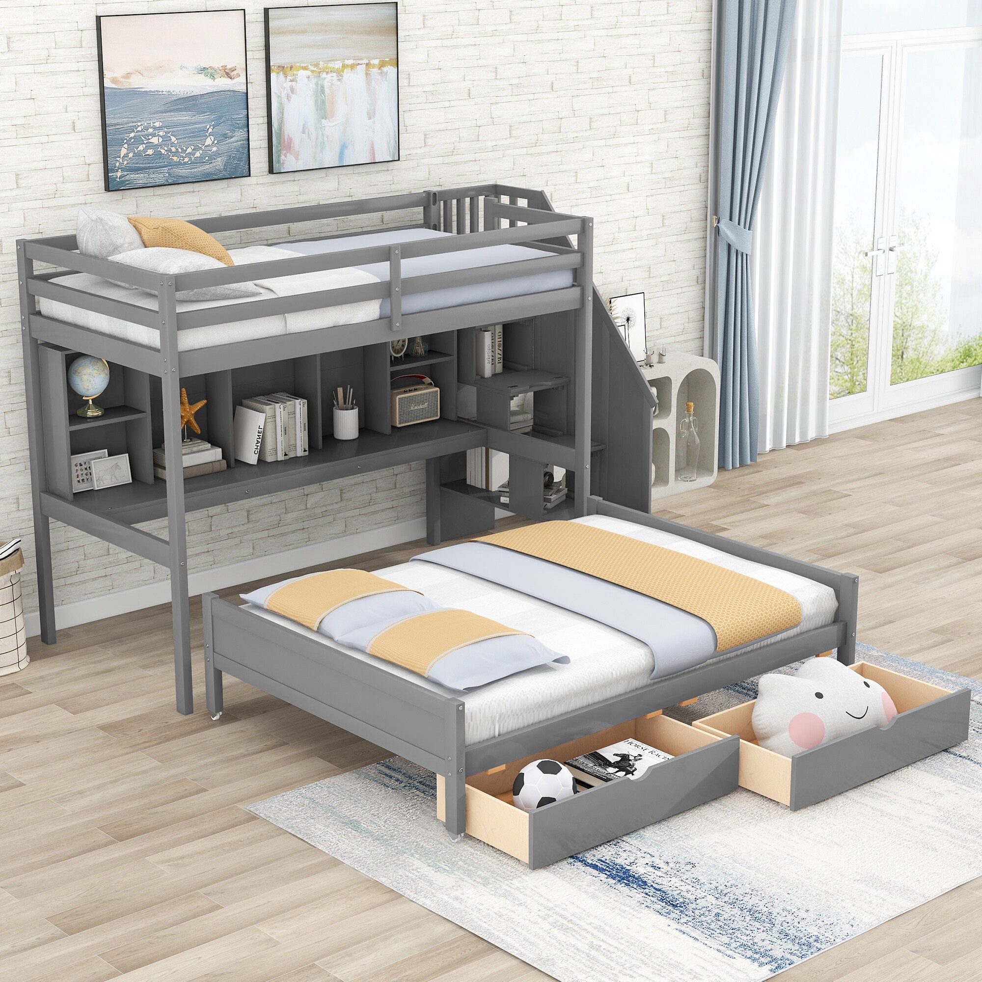 Twin XL over Full Bunk Bed with Built-in Storage Shelves, Drawers and Staircase, Gray